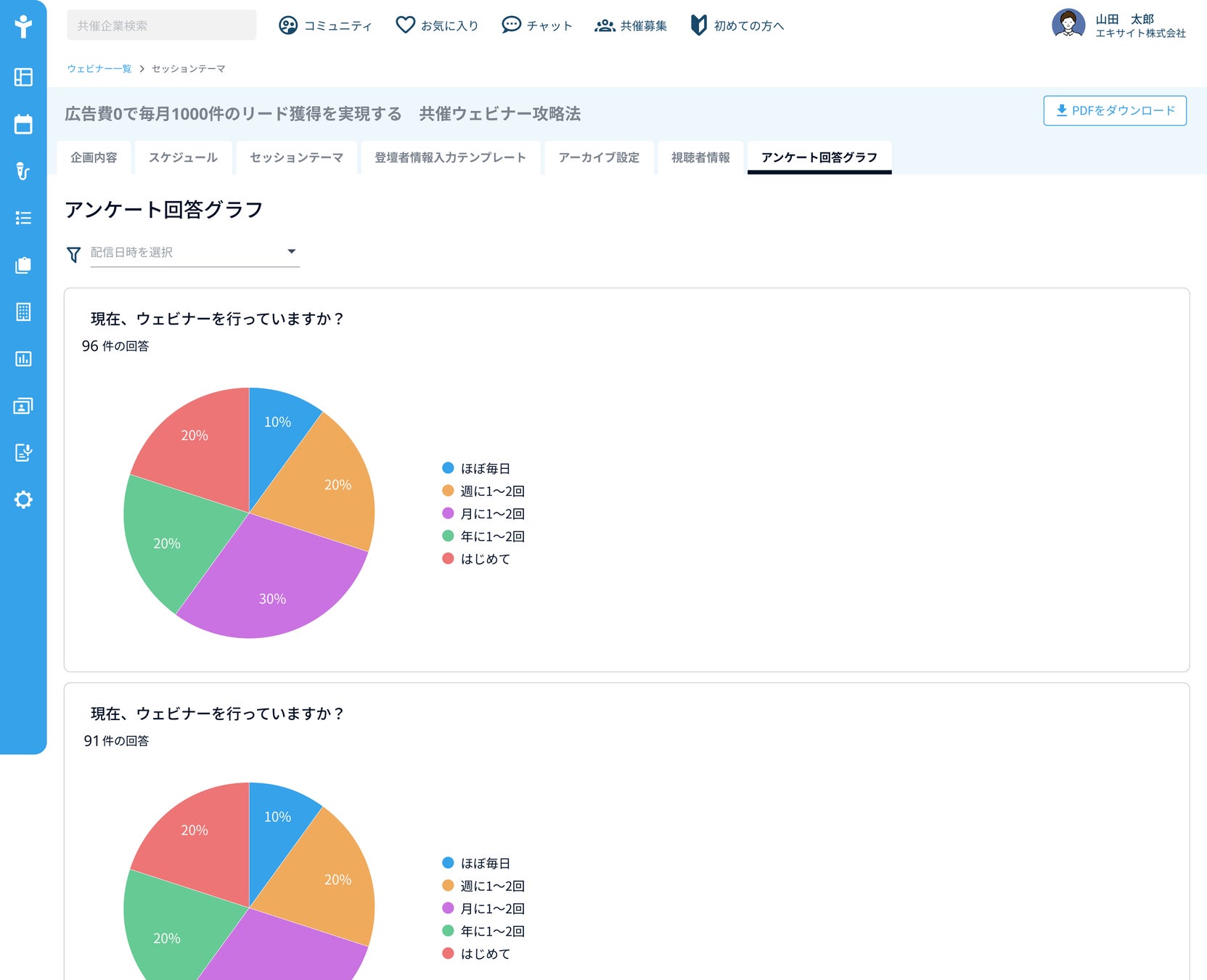 通常の録画配信とは異なり、視聴者が即資料をダウンロードできるUIを設計しています。アンケートも常時表示することができるため、高い回答率を担保することが可能です。