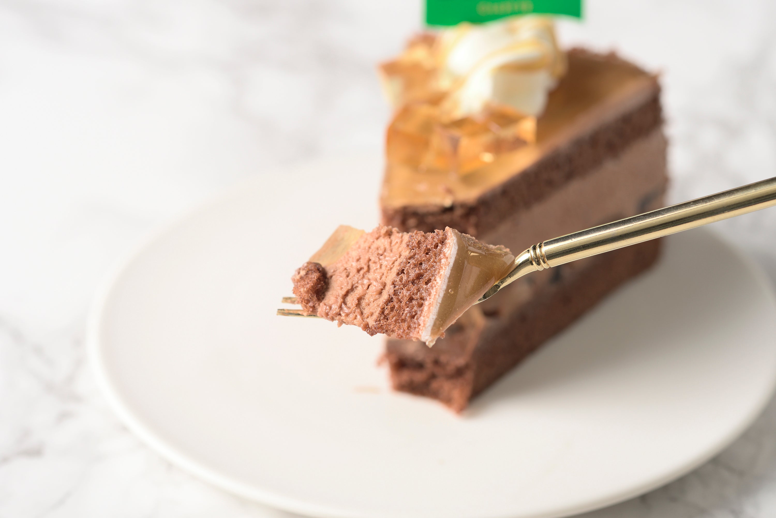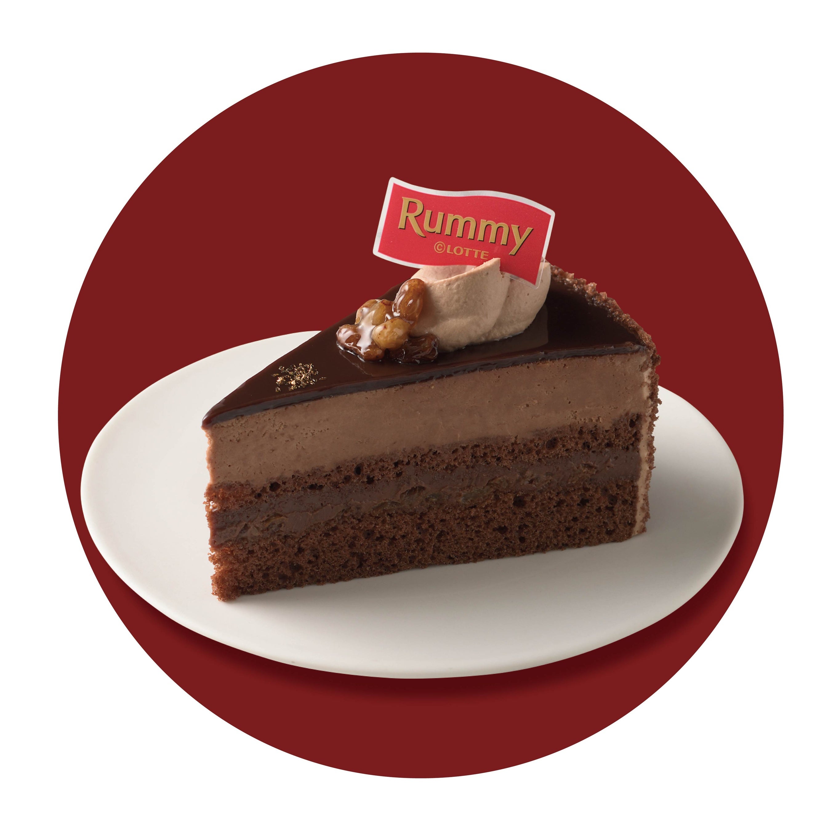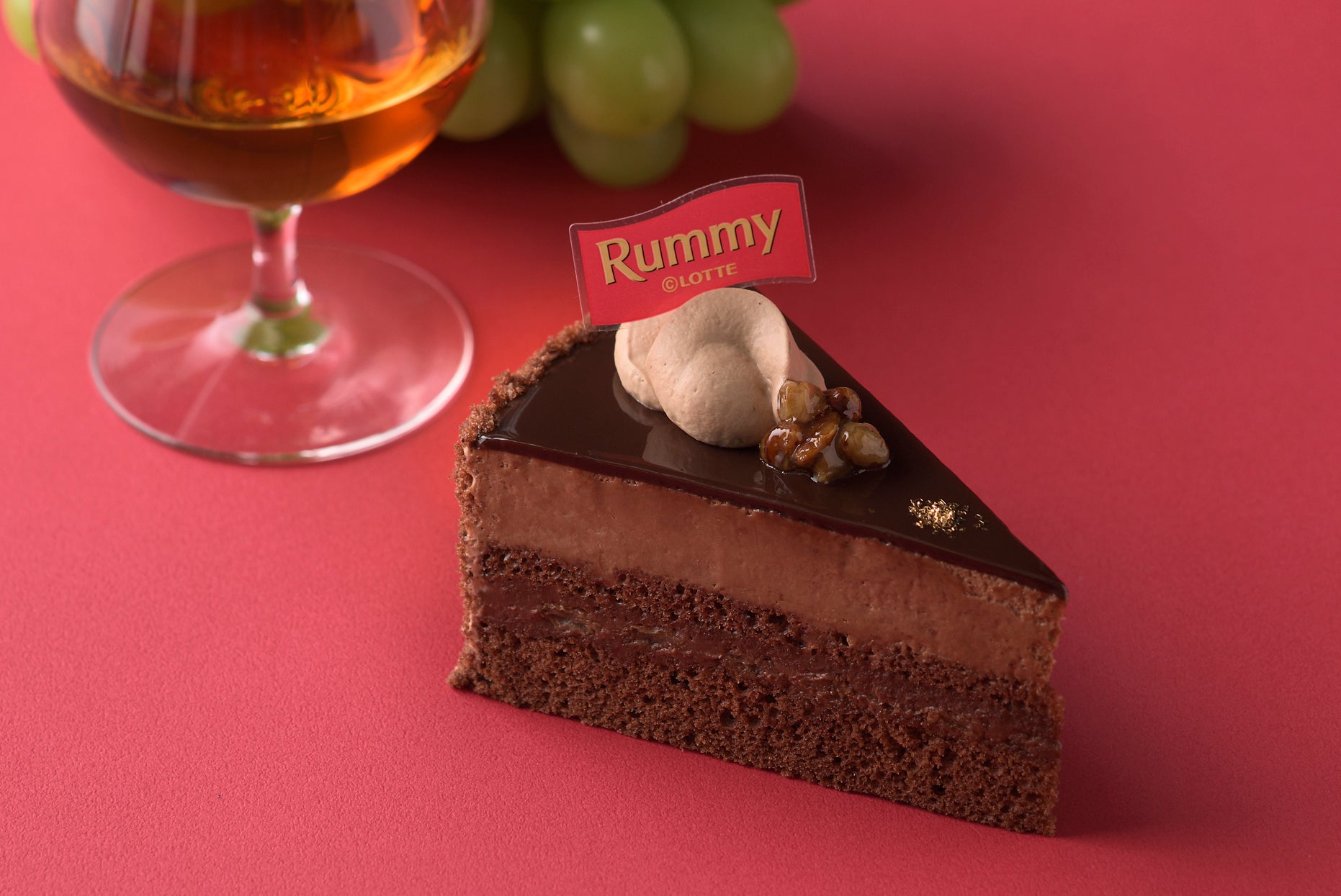 みずみずしいラムレーズンと生チョコをとじ込めた、ロッテの本格洋酒チョコレート「ラミー」の魅力を生ケーキで表現しました。「ラミー」らしさを追求し、「ラミー」と同じラムレーズンとラム酒を使用。ラム酒を練り合わせてラムレーズンを混ぜ込んだ“ミルクチョコガナッシュ”と、ラム酒を効かせた“ミルクチョコムース”を重ね、上面は「ラミー」の色をイメージしてココアグラサージュで仕上げました。