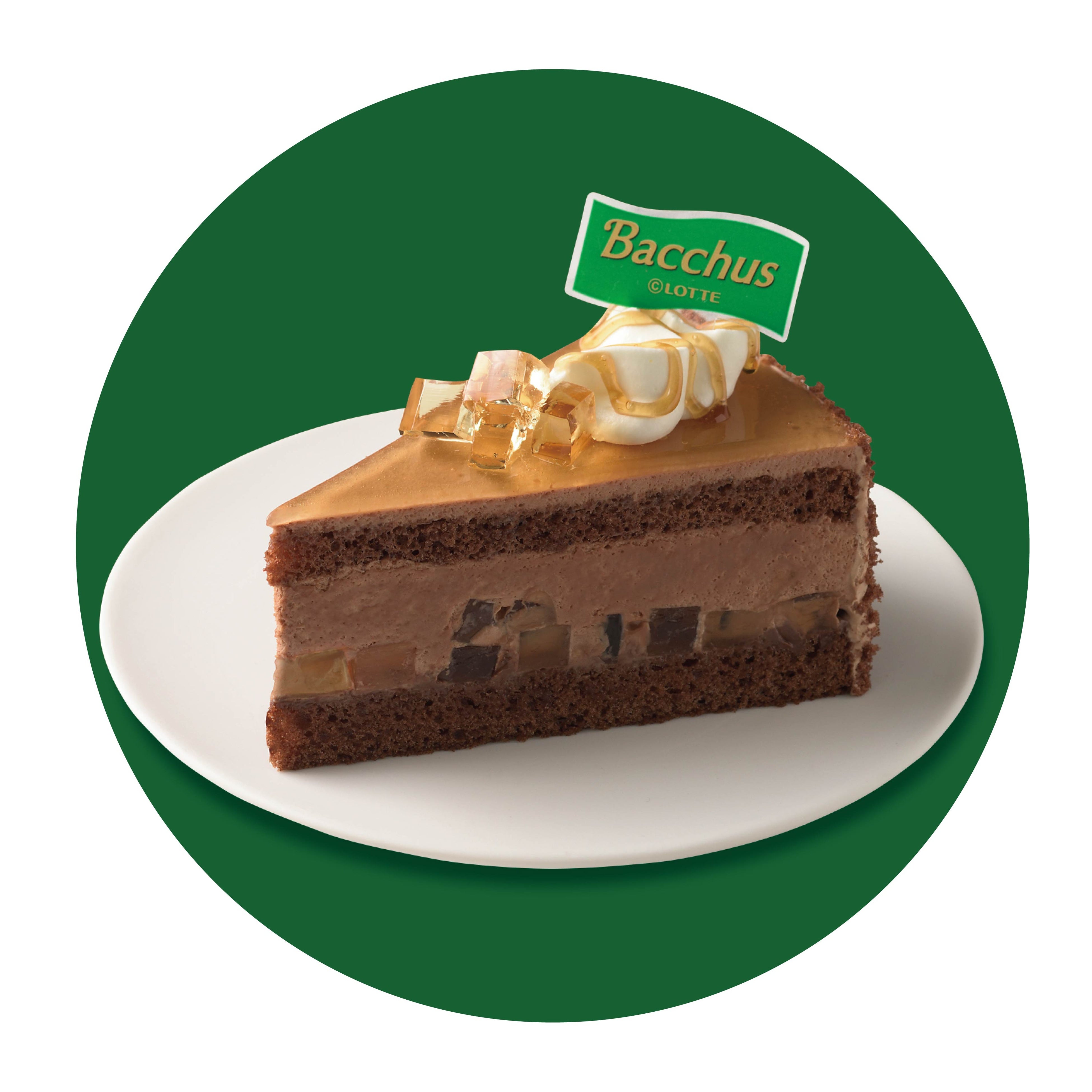 芳醇なコニャックを口どけまろやかなミルクチョコレートで包んだ、ロッテの本格洋酒チョコレート「バッカス」の魅力を生ケーキで表現しました。「バッカス」らしさを追求し、「バッカス」と同じブランデー(コニャックを60%使用)を使用。ブランデーを練りこんだ“チョコガナッシュ”と“ミルクチョコムース”、“ブランデーゼリー”をココアスポンジでサンド。上面は「バッカス」をイメージしてブランデーゼリー、ブランデージュレ、ブランデーソースで仕上げました。