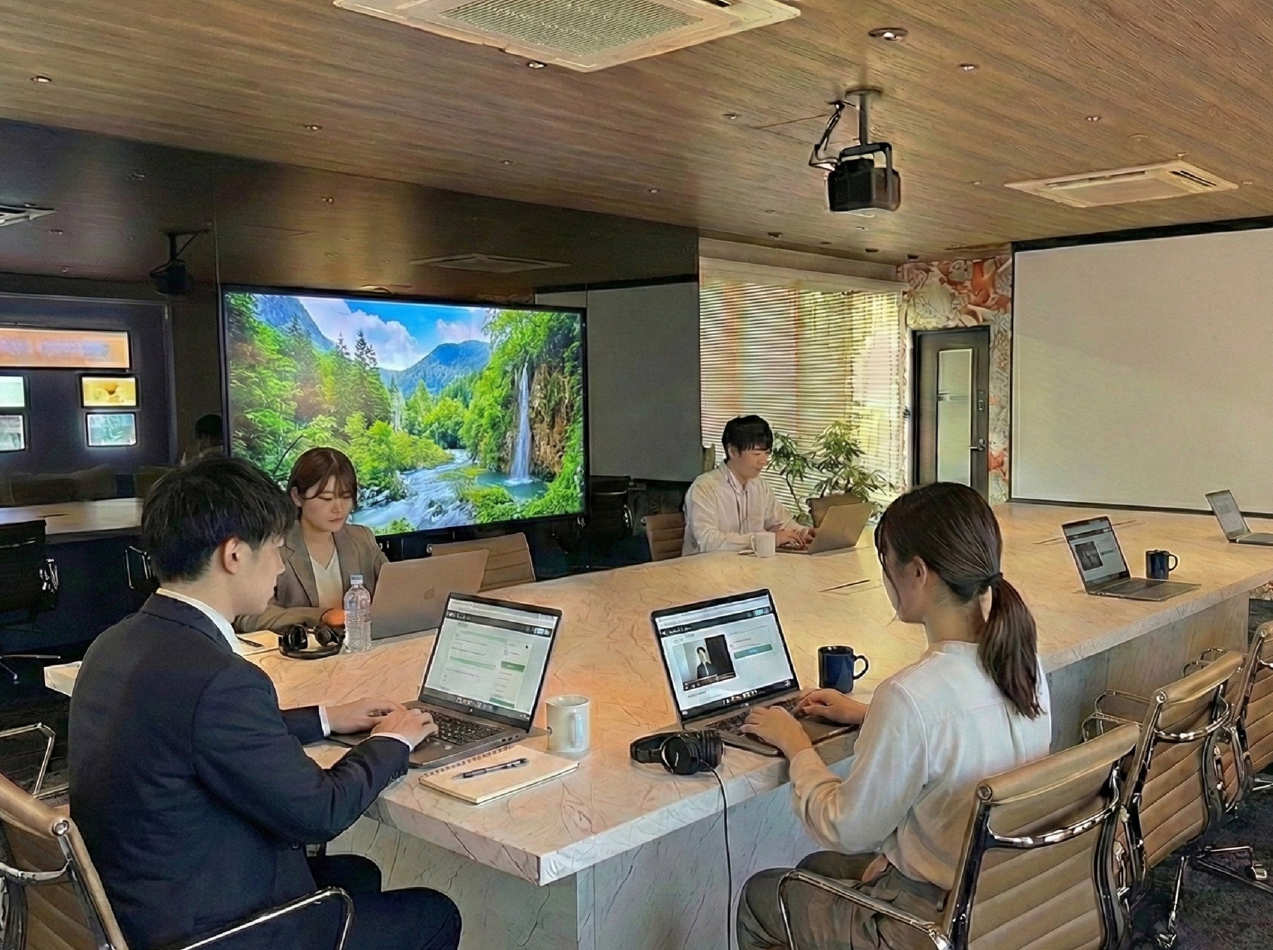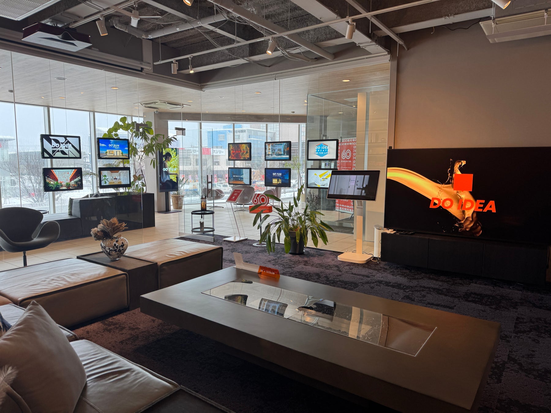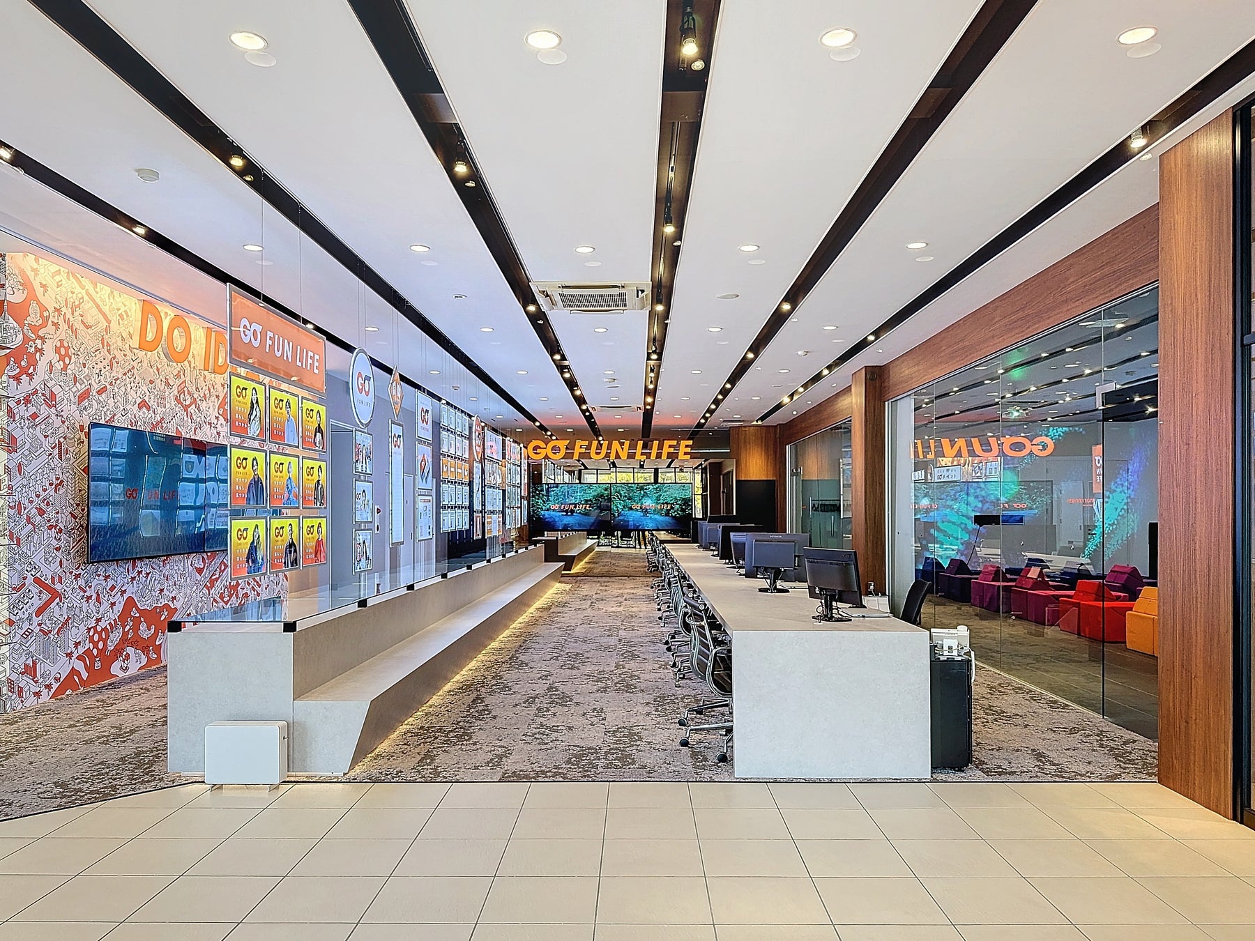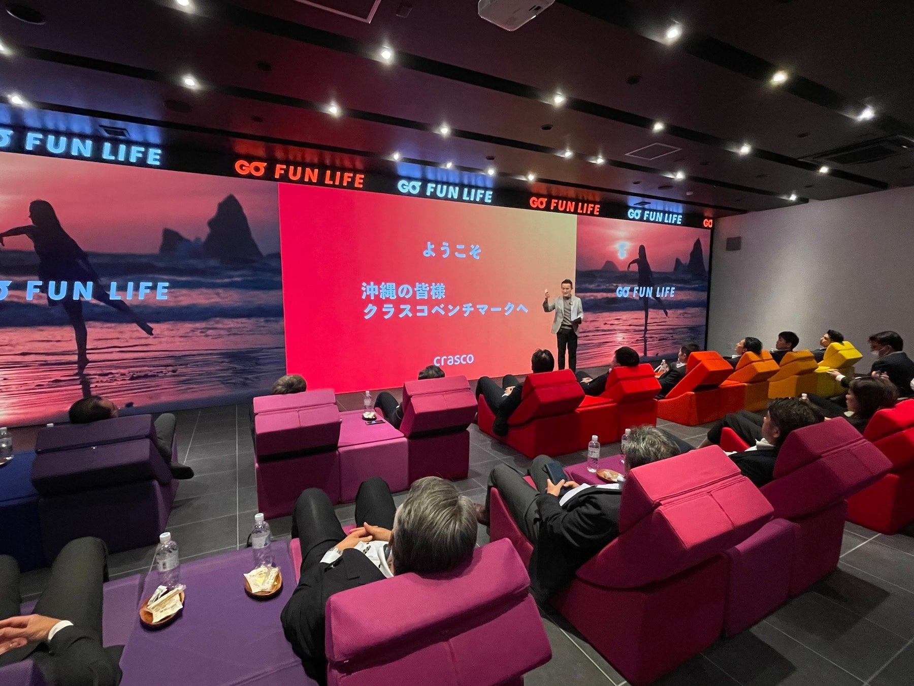 クラスコのオフィスは、ビジョン『GO FUN』を五感で体感できる空間設計が特徴です。ロゴや映像による視覚体験、独自のブランド音楽による聴覚体験、素材や照明による触覚体験、アロマによる嗅覚体験を融合し、来訪者の感情に直接訴えかけるブランド体験を構築しています。