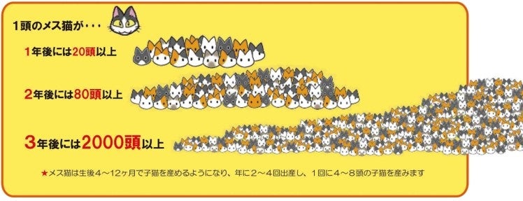 一般に飼養される動物の多くは、一度にたくさんの子を産みます。その中でも特に猫は繁殖力が強く、年に2~4回発情期があり、交尾を行うとほぼ100%の確率で妊娠し、1回に4~8頭の子を産みます。適正に飼養しなければ「ねずみ算式」に数が増えてしまいます。