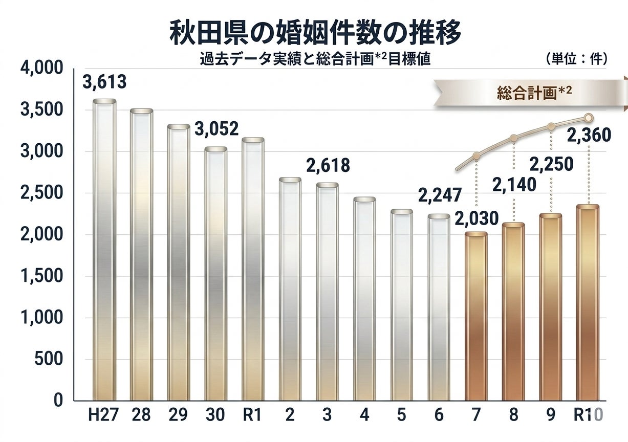人口減少が深刻化する秋田県においても婚姻件数の減少は喫緊の課題と考え、今年4月からスタートした総合計画*²における重要な政策指標として掲げられています。施策ごとに目標値を設定しており、婚姻件数を目標値まで伸ばすためには、結婚支援の“実効性を高める施策検討”が重要であることから、IBJの持つ専門的な知見や実績、培ったノウハウが役立つと考え連携協定を結ぶ運びとなりました。