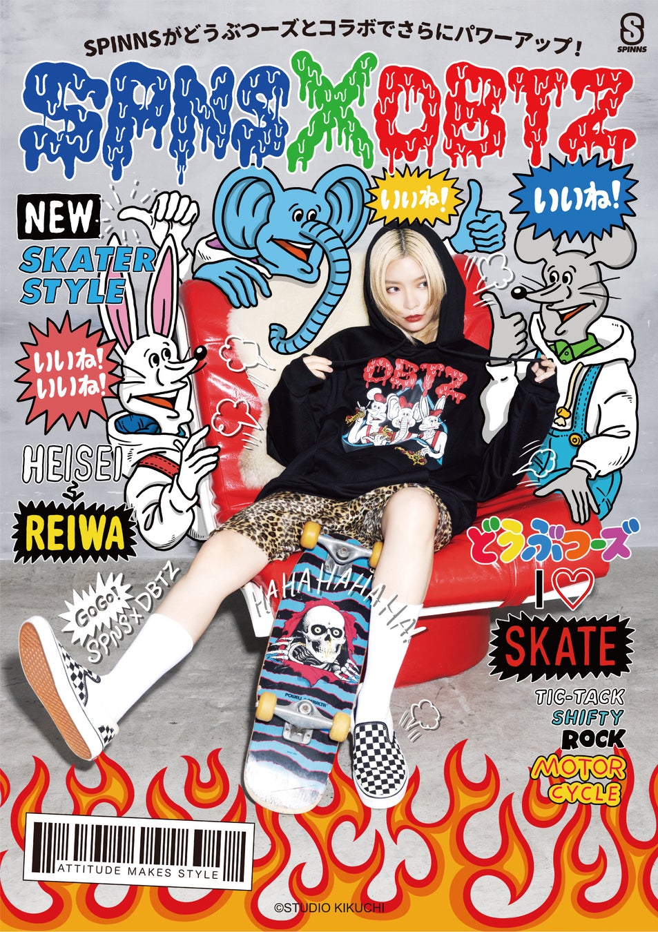 今回は、最近注目される平成ブームに乗せて大人気キャラクター「どうぶつーズ」と原宿ファッションの代名詞「SPINNS」がタッグを組み、青文字スケーター系のエッセンスをたっぷり詰め込んだアイテムをご用意いたしました。