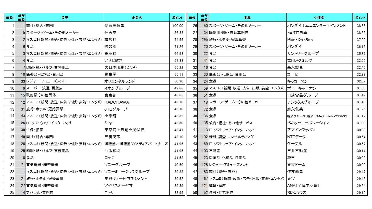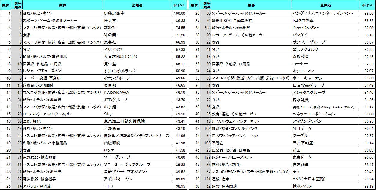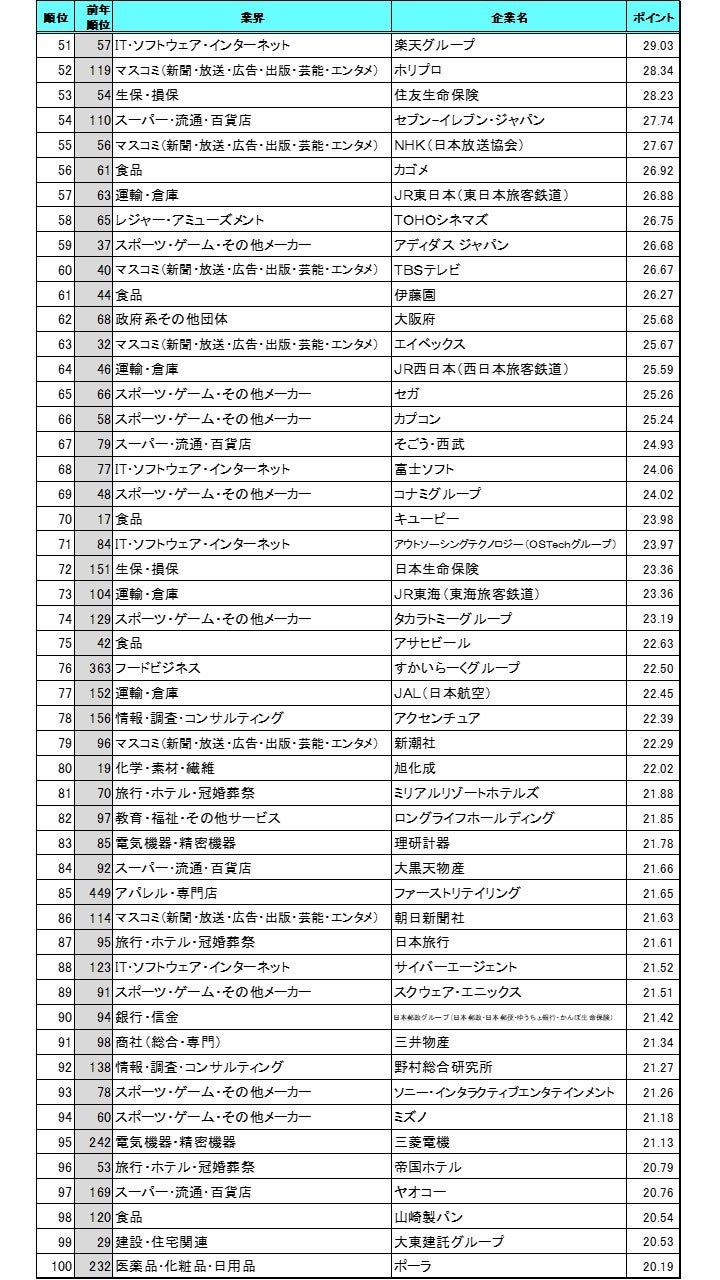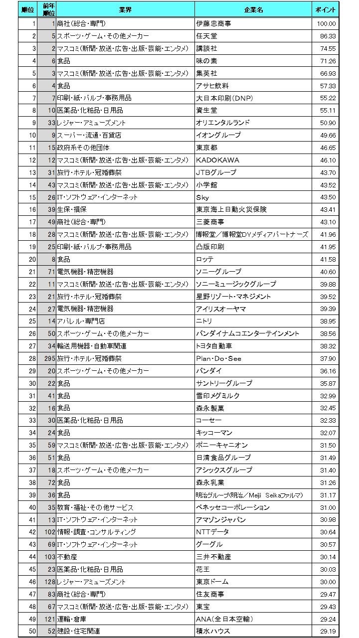 (3)4位の味の素、6位のアサヒ飲料など、食品は安定した人気。50位以内に10社が入り、業界別最多を記録
