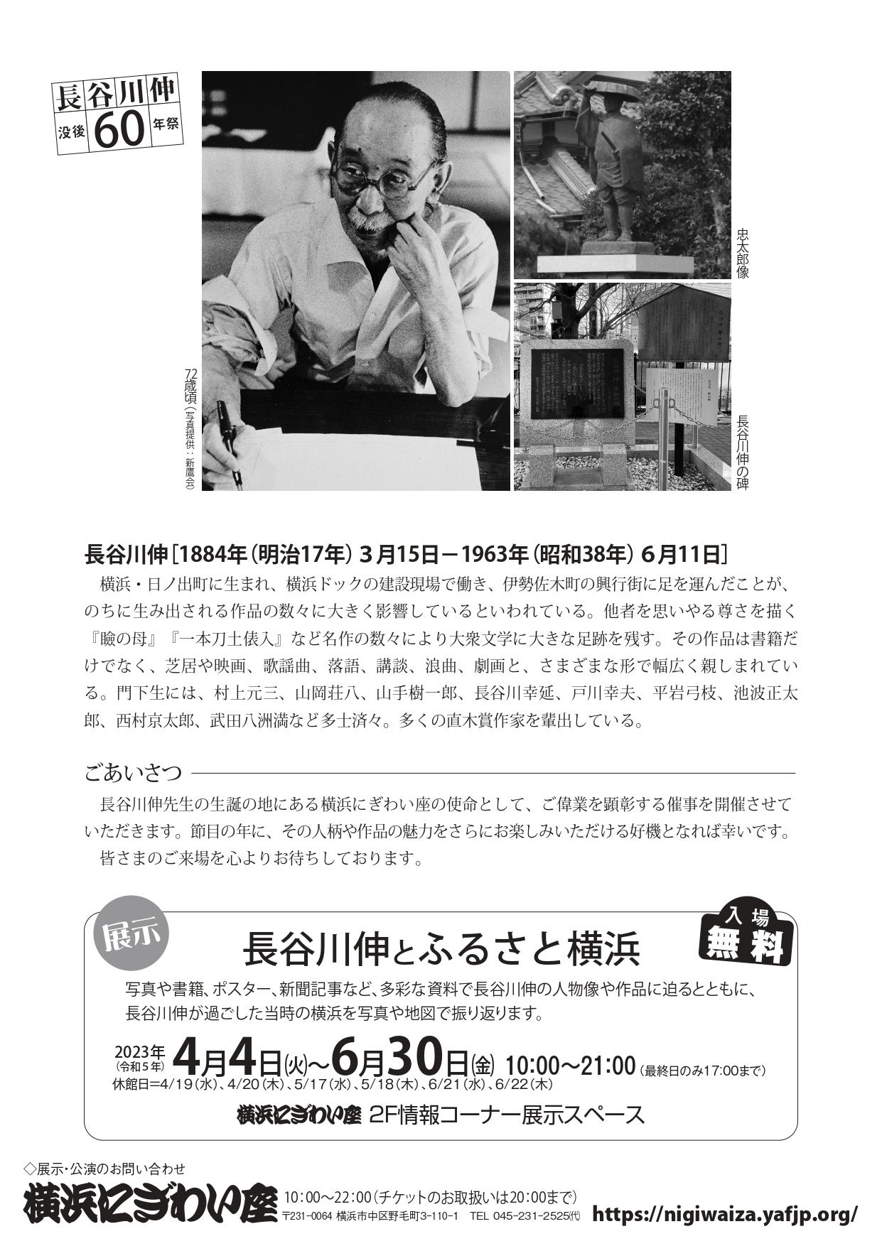 節目の年に、生誕の地にある横浜にぎわい座では、展示と公演の2本立てで長谷川伸の偉業をご紹介します。