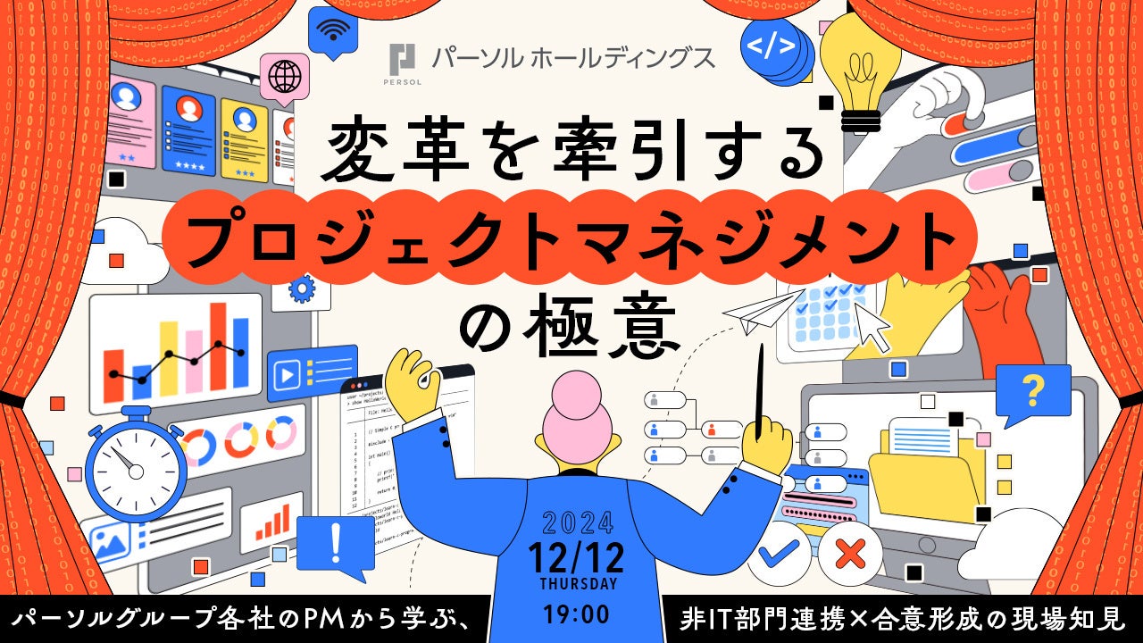 「はたらいて、笑おう。」をグループビジョンに掲げるパーソルホールディングス株式会社(本社:東京都港区、代表取締役社長 CEO:和田 孝雄、以下パーソルホールディングス)は、プロジェクトマネジャーやIT部門の責任者などに向けて、特別オンラインイベント「変革を牽引するプロジェクトマネジメントの極意~パーソルグループ各社のPMから学ぶ、パートナー協働×合意形成の現場知見~」を2024年12月12日(木)19時~開催することをお知らせします。
