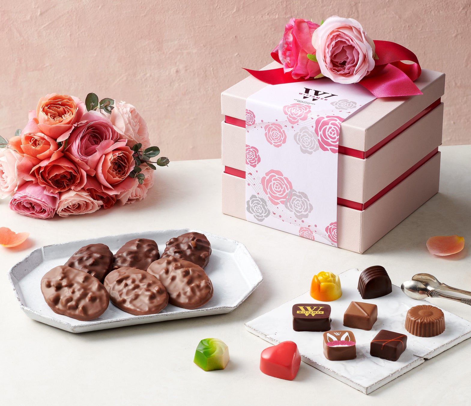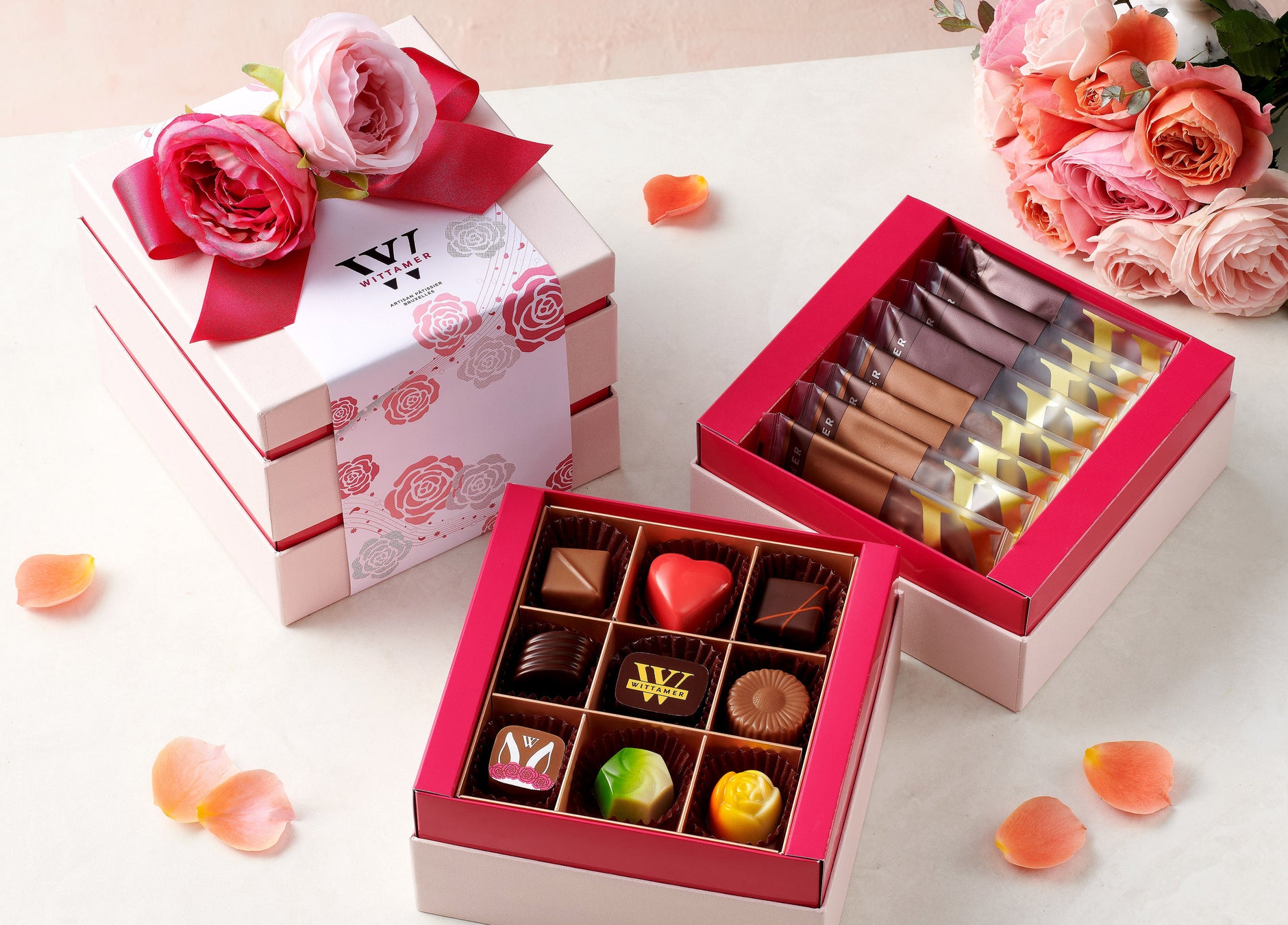 フランス語で母の日を表す『ラ フェット デ メール』はバラのオーナメントや掛け紙が華やかな特別なギフト。上段はヴィタメールを代表するプラリネショコラのお重。人気の定番ショコラや期間限定の春らしいショコラなど、多彩な味わいのガナッシュを包み込んだ艶やかなショコラを詰め合わせました。