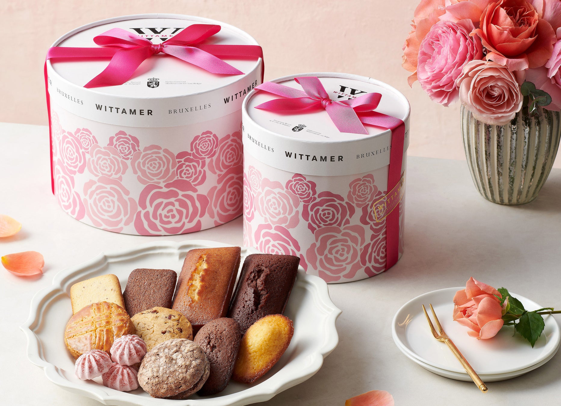 バラエティ豊富な洋菓子を詰めこんだ『フルーレット・エッセンシャル』。バターとアーモンドの風味豊かなフィナンシェやザクザク食感に焼き上げたハイデザント、苺の甘酸っぱさとやさしい香りが広がるメレンゲなど、ヨーロッパ伝統の焼き菓子たちを期間限定BOXに詰め合わせました。BOXいっぱいに咲き誇る華やかな薔薇のパッケージは、母の日はもちろん誕生日などのお祝いにもぴったりです。