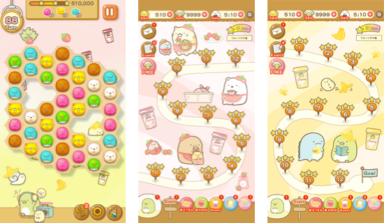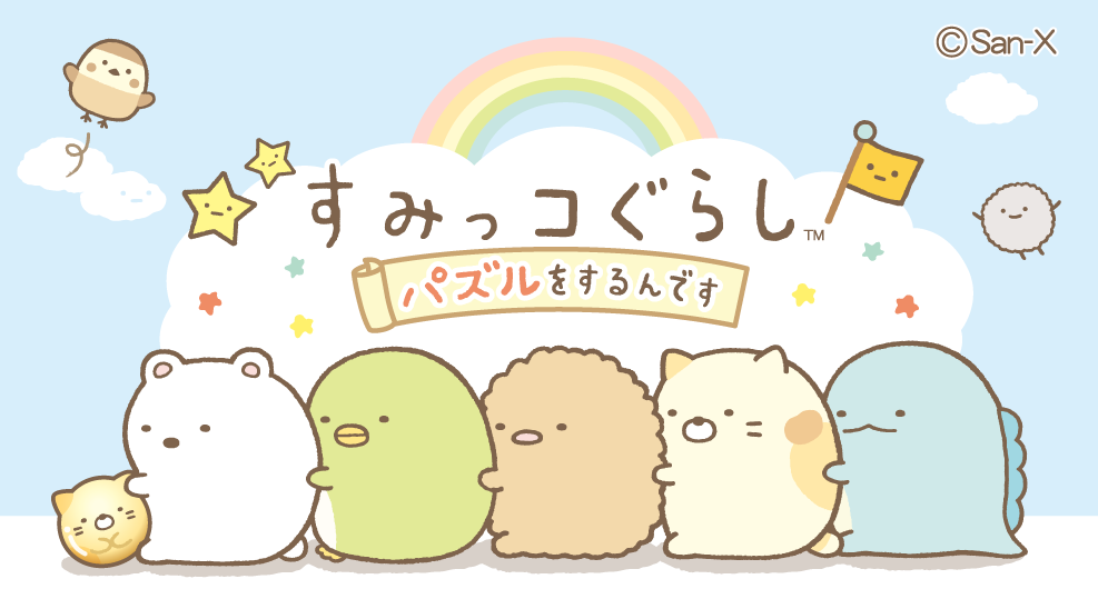 しろくま、ぺんぎん?、とんかつ、ねこ、とかげ、たぴおかの形をした「すみっコ玉」を使ったパズルをクリアしながら可愛いすみっコを集める大人気スマートフォンゲームです。