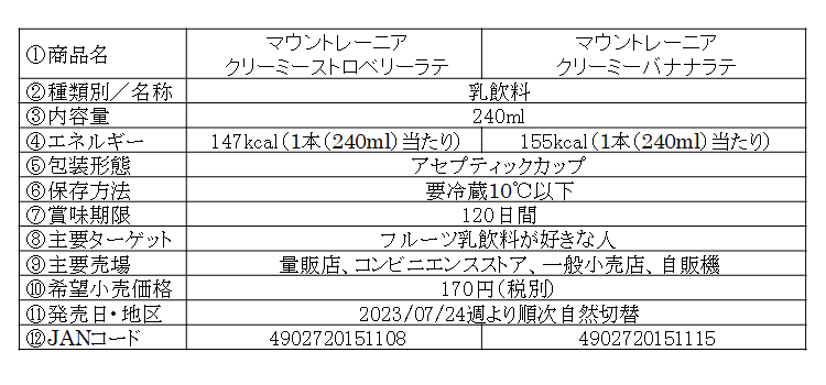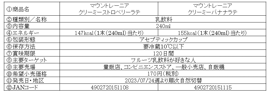 ③「マウントレーニア クリーミーバナナラテ」はしっかりとしたミルク感と、完熟バナナ果汁の濃厚な甘さをお楽しみいただけます。