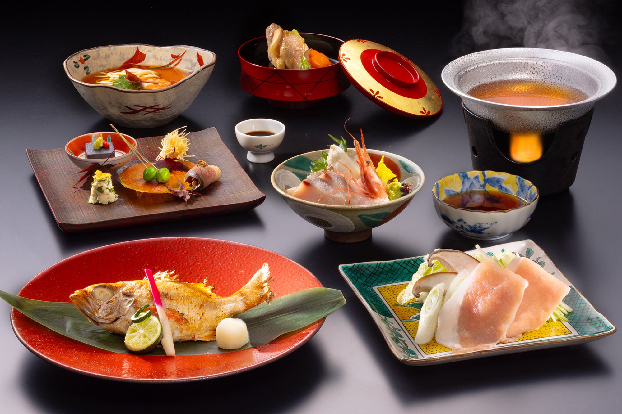ノドグロや甘海老、ズワイ蟹、輪島ふぐ、寒ブリなど新鮮な海の幸、五郎島金時芋や金時草などの加賀野菜は、造りや郷土料理、揚げたて天婦羅など会席料理でお召し上がりいただけます。