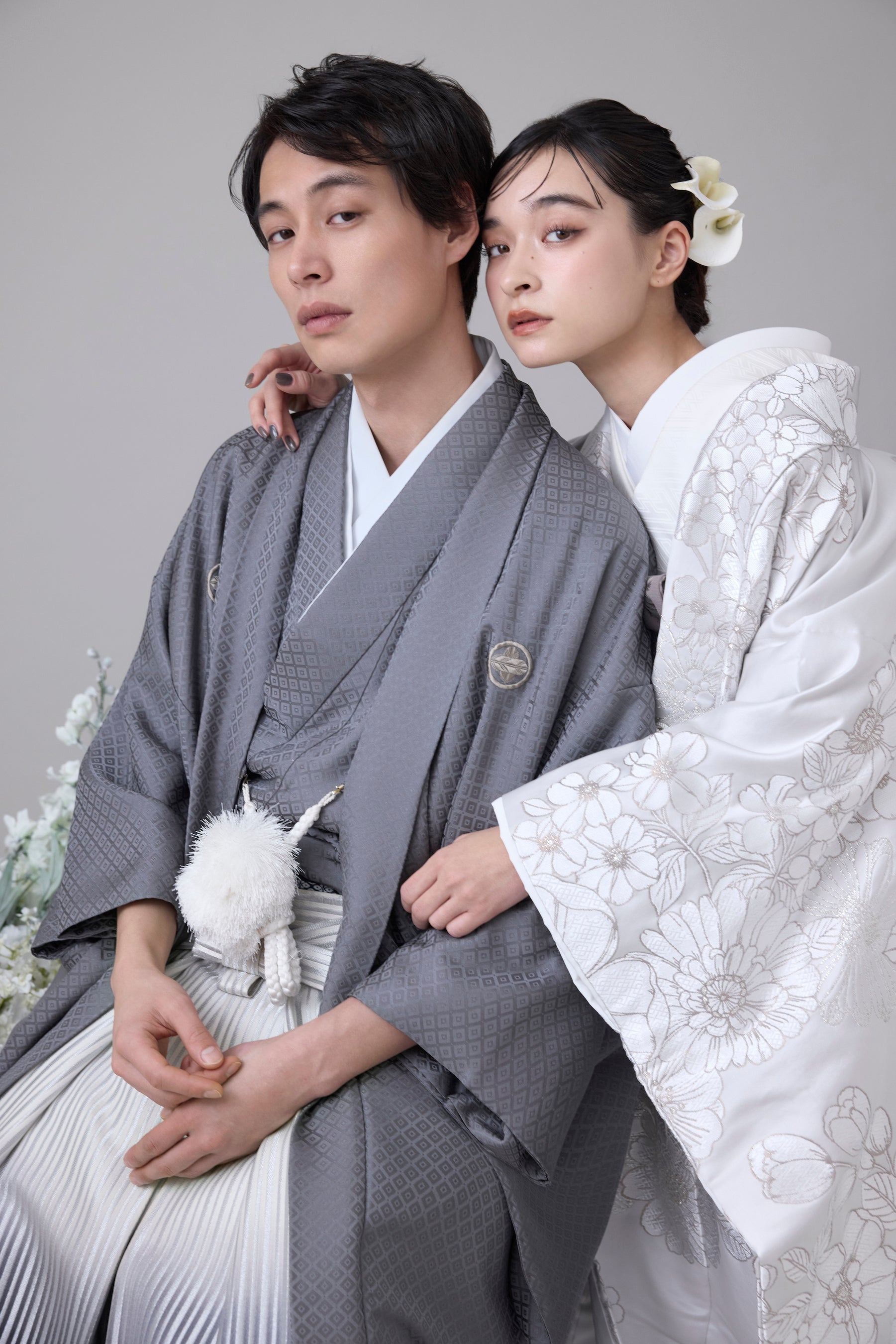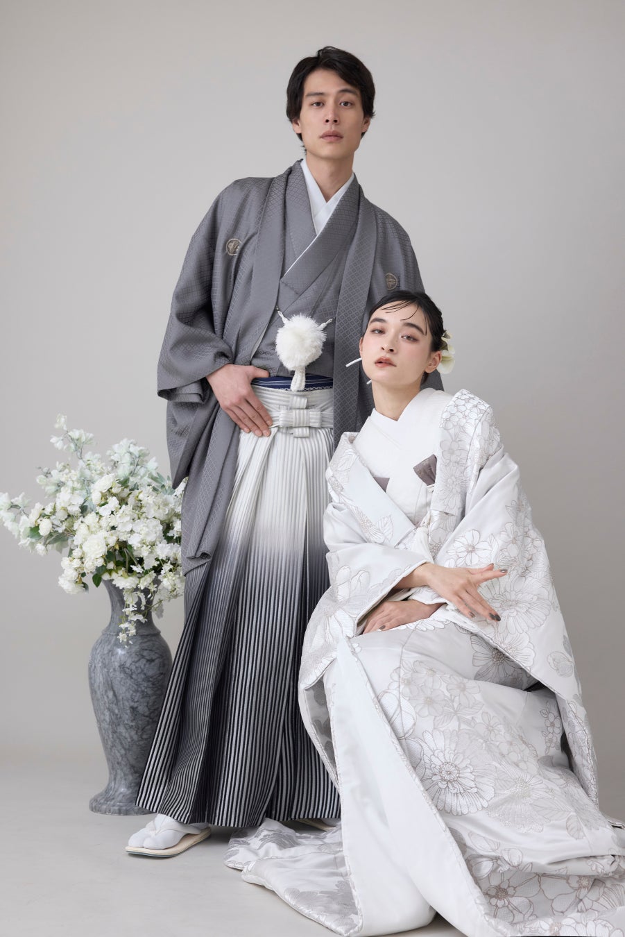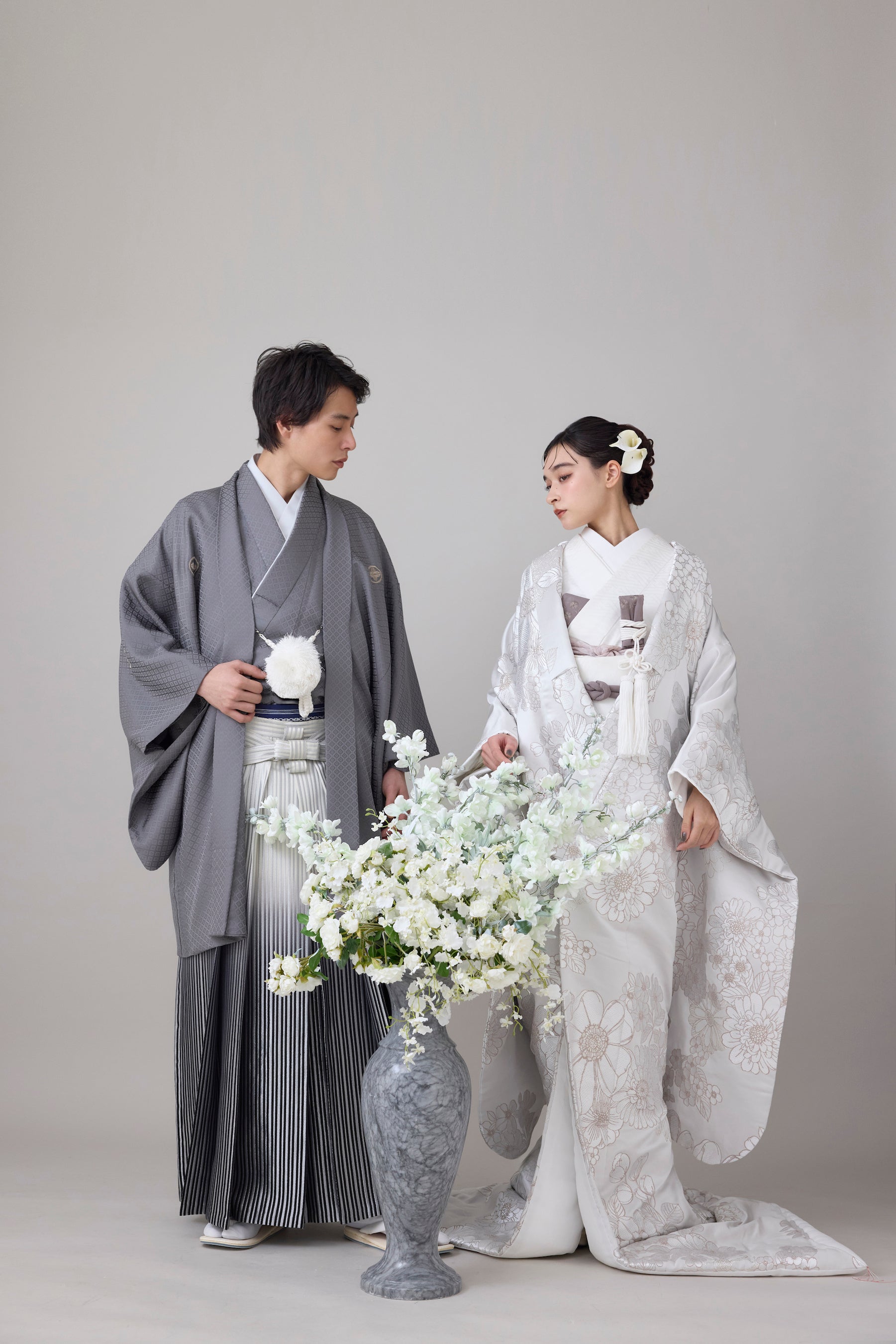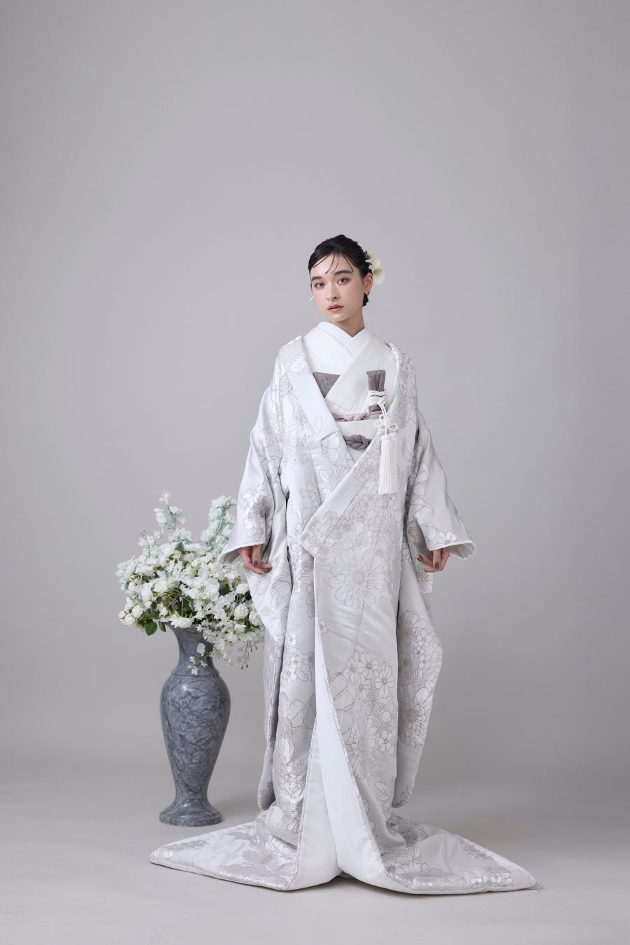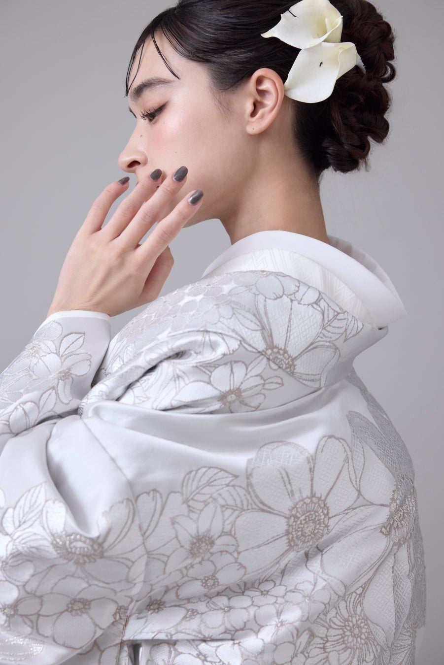 aim東京原宿店にシルバー調の花柄白無垢が入荷いたしました。品のある艶感と色味が印象的な洗練された雰囲気の1着です。グレーで統一した新背景と合わせてご紹介いたします。
