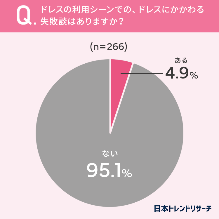 4.9%の方がドレスの利用シーンでの、ドレスにかかわる失敗談が「ある」と回答しています。