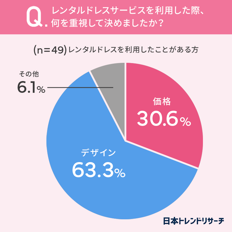 63.3%の方がレンタルドレスサービスを利用した際、「デザイン」を重視して決めたと回答しています。
