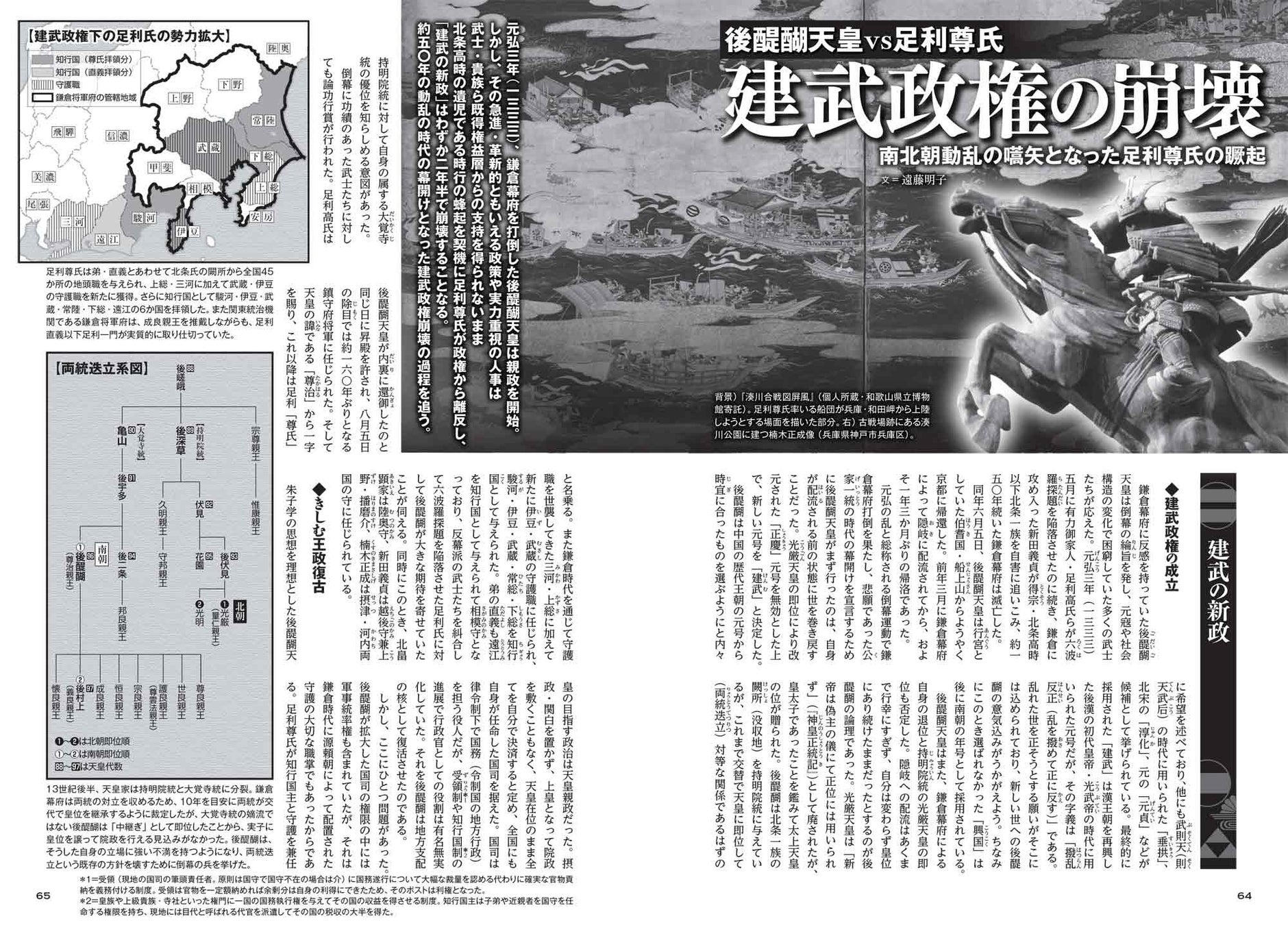 第三特集「後醍醐天皇vs足利尊氏 建武政権の崩壊 南北朝動乱の嚆矢となった足利尊氏の蹶起」は、小誌2024年8月号掲載の特集「鎌倉幕府の滅亡」の続編。幕府滅亡後の後醍醐天皇主導による「建武の新政」の開始、前執権・北条高時の遺児・時行による鎌倉奪還(=「中先代の乱」。週刊少年ジャンプでの松井優征の連載でアニメ化もされた「逃げ上手の若君」のテーマともなっています)、その後の後醍醐と尊氏の対立、後醍醐方の新田義貞、楠木正成らの軍勢と尊氏方との決戦である湊川の戦いの顛末まで、激動の時代をたどります。