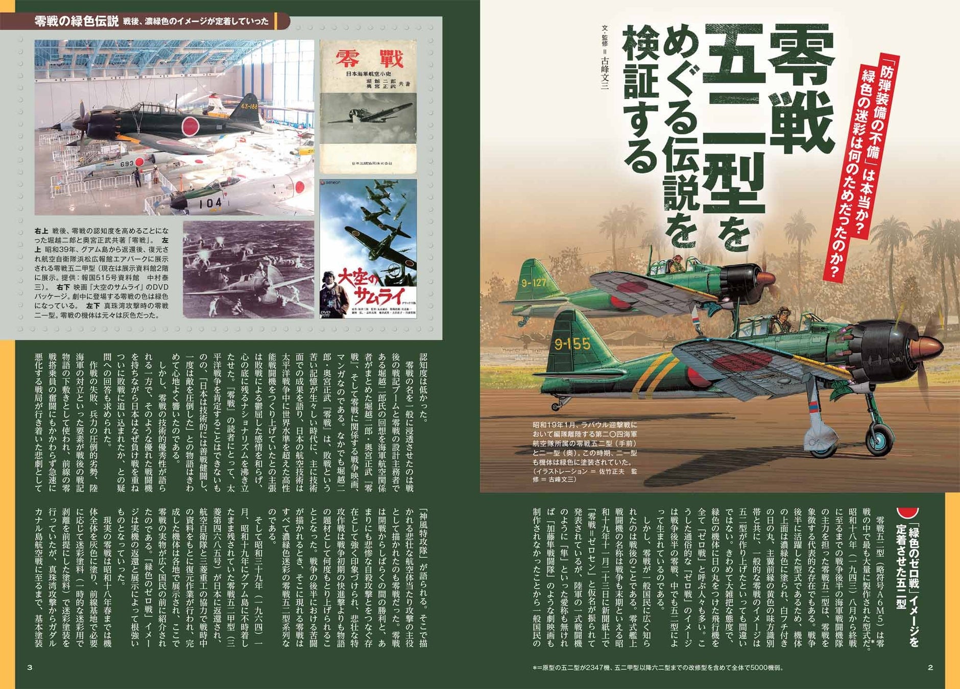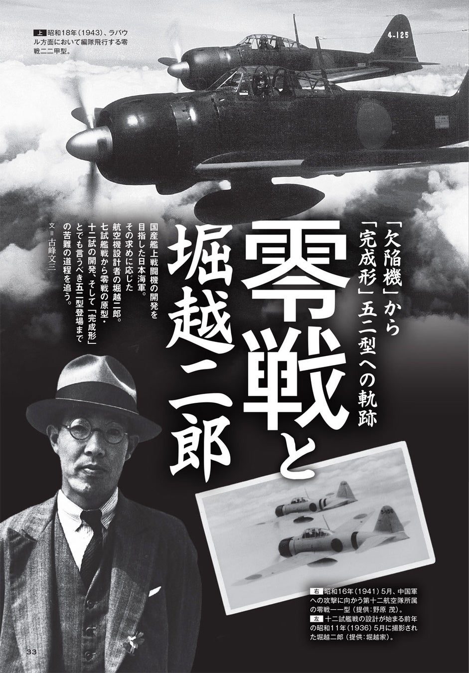第一特集の「零戦と堀越二郎」では、さまざまな問題点を抱えていた零式艦上戦闘機が、いかにして問題点を克服し、「完成形」とでもいうべき五二型へと至ったのかを、設計者・堀越二郎の関わりとともにたどっていきます。特に太平洋戦争開戦前に発生した2度の空中分解事故と事故原因の究明、そして、問題点がどのように解消されたかを、詳しく解説しています。