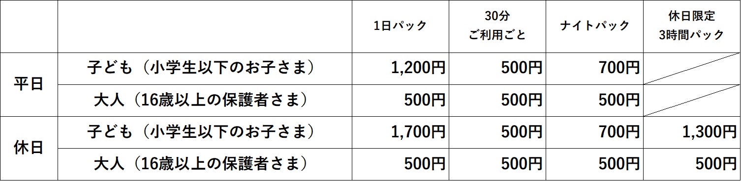 ※スクールホリデー期間(春休み・GW・夏休み・冬休み等)は平日でも休日料金となります。