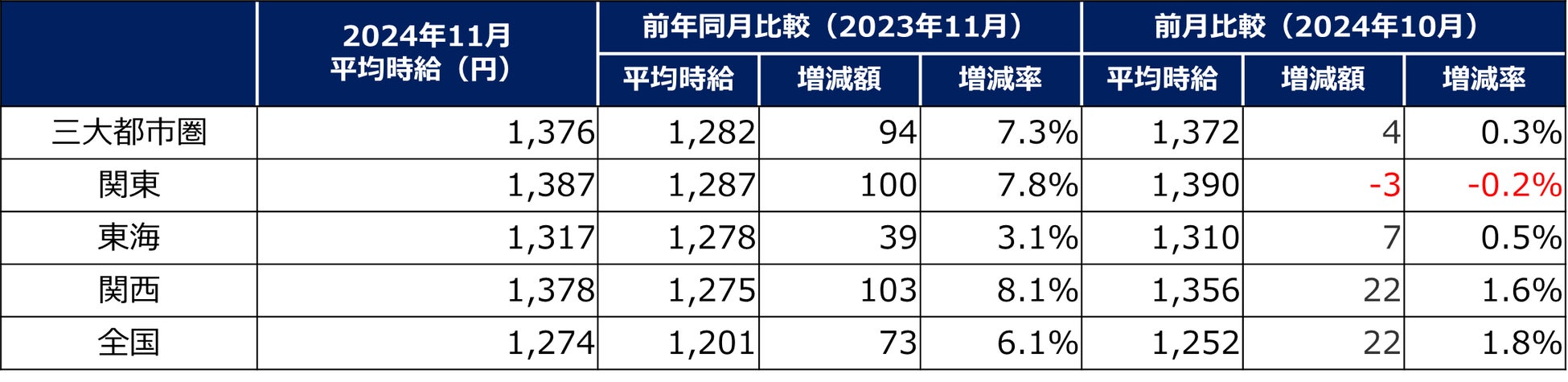 11月度の三大都市圏平均アルバイト・パート時給は1,376円(前年同月比+94円、7.3%増/前月比+4円、0.3%増)。全国平均時給は1,274円(前年同月比+73円、6.1%増/前月比+22円、1.8%増)で、いずれも前年同月、前月を上回りました。