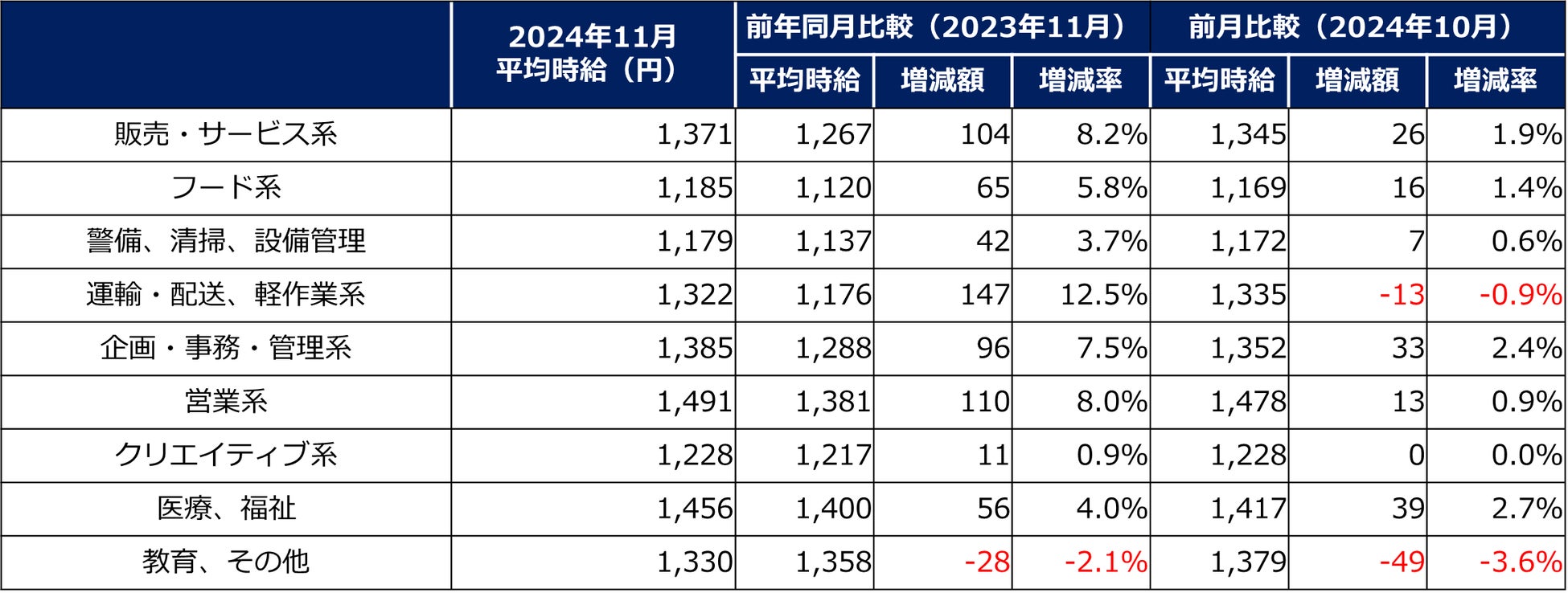 職種別平均時給は【教育、その他】を除く全職種で前年同月を上回る。