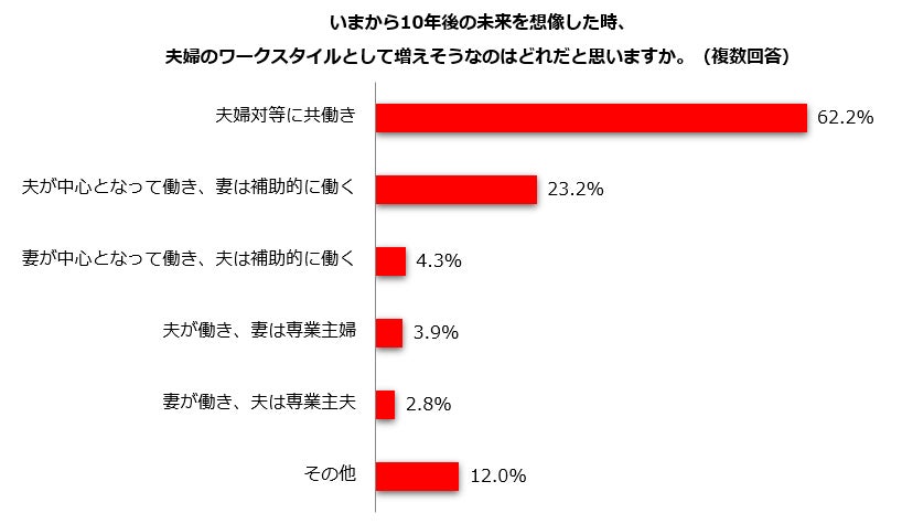 これからの夫婦の働き方は、どのようになっていくのか。主婦層を中心とする就労志向の女性に「いまから10年後の未来を想像した時、夫婦のワークスタイルとして増えそうなのはどれだと思いますか」と尋ねたところ、「夫婦対等に共働き」との回答が最も多く62.2%でした。前回調査(※)した2020年と比較すると2.1ポイント上昇しています。一方「夫が中心となって働き、妻は補助的に働く」と回答した人は10.1ポイント減少しました。より妻と夫が対等に働く傾向が強まると感じている人が増えている様子が伺えます。
