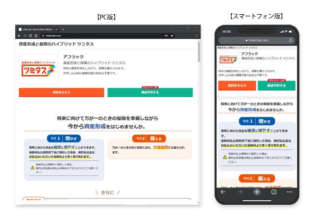 株式会社アドバンスクリエイト(本社:大阪府大阪市、代表取締役社長:濱田 佳治、東証プライム・福証・札証、証券コード:8798、以下「当社」、https://www.advancecreate.co.jp/)が運営する国内最大級の保険選びサイト「保険市場」( https://www.hokende.com/)において、アフラック生命保険株式会社(本社:東京都新宿区、代表取締役社長:古出 眞敏、以下「アフラック」)の『資産形成と保障のハイブリッド ツミタス』の掲載を開始いたしましたので、お知らせいたします。
