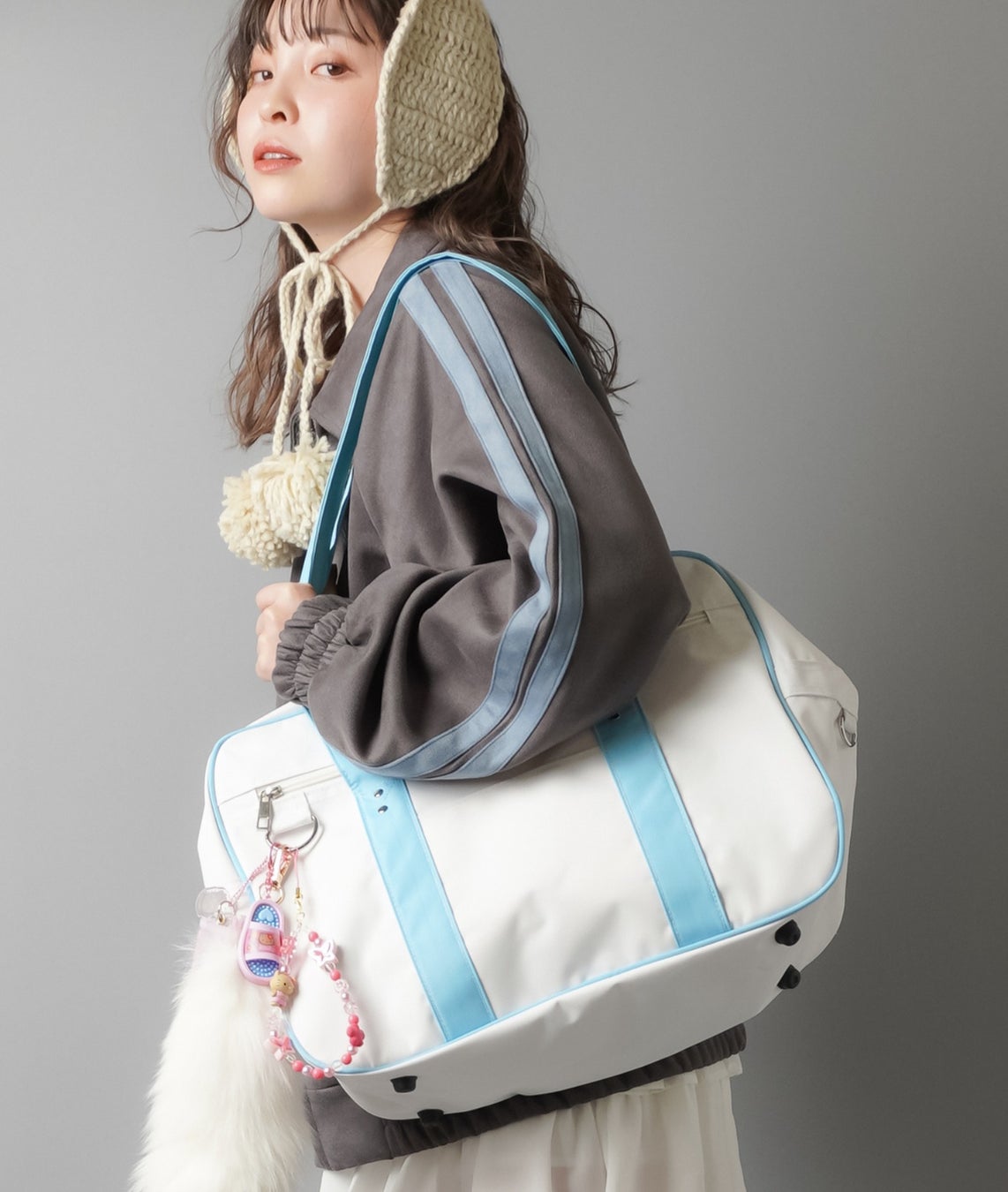 前面にファスナー付ポケットが付いた二層式で、内側には仕切りのついた多機能ポケット、ペットボトルポケットが付いて使いやすくなっています。A4サイズも収納でき、収納力抜群。前面と両サイドにDカンが付いているので、キーホルダーやぬいぐるみなどをたくさん付けて自分らしさを表現することができます。