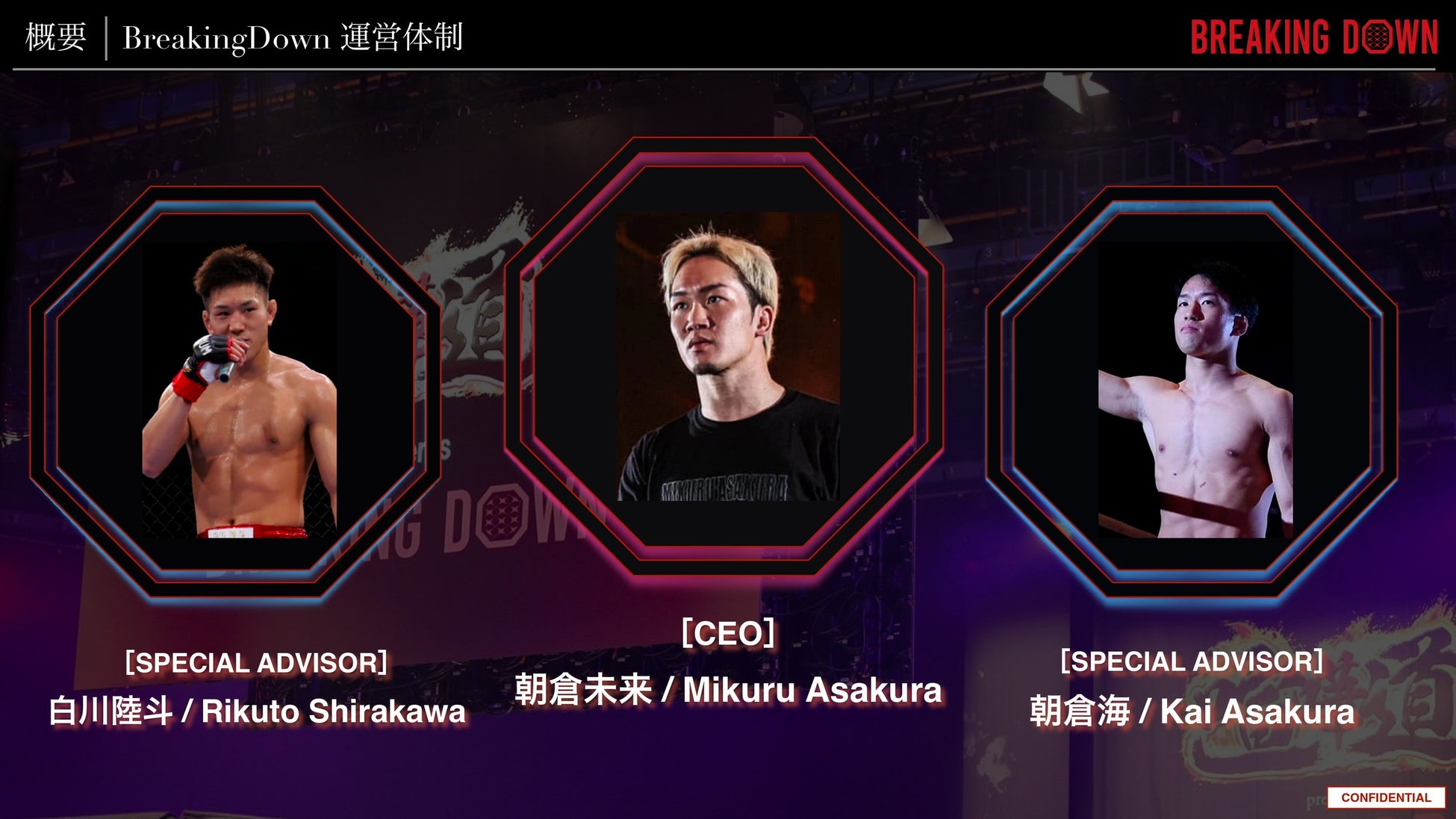 登録者数340万人超え(2025年4月現在)の人気YouTuberでもある総合格闘家の朝倉未来がCEOを務め、スペシャルアドバイザーとして総合格闘家の朝倉海、総合格闘家の白川陸斗が参画しています。
