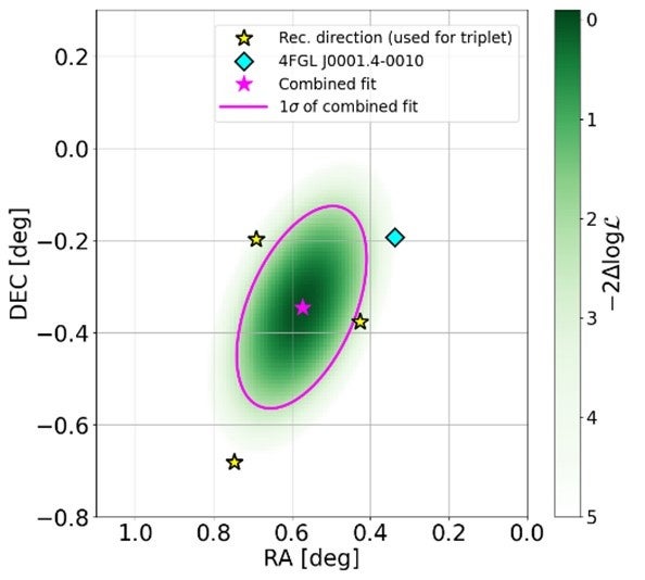 この triplet 事象の到来方向の分布を図2に示します。黄色の星印が3事象それぞれの到来方向(推定値、誤差は含まない)、緑の領域が、triplet事象から見積もられた爆発天体の方向の確率分布を示しています。紫の楕円は68%の確率でこの範囲内に存在することを示す境界線です。この領域に近い既知の天体には、NASAが運用するフェルミガンマ線望遠鏡衛星で観測された活動銀河核、FBQS J0001-0011があります (水色の菱形)。