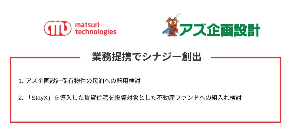 私たちはアズ企画社と高田馬場で無人運営する民泊で取引をしており、今回の業務提携により、協力関係を強化し、お互いの事業発展に貢献していきます。アズ企画社保有物件の民泊への転用検討や、「StayX」を導入した賃貸住宅を投資対象とした不動産ファンドへの組入れ検討などの取り組みを想定しています。