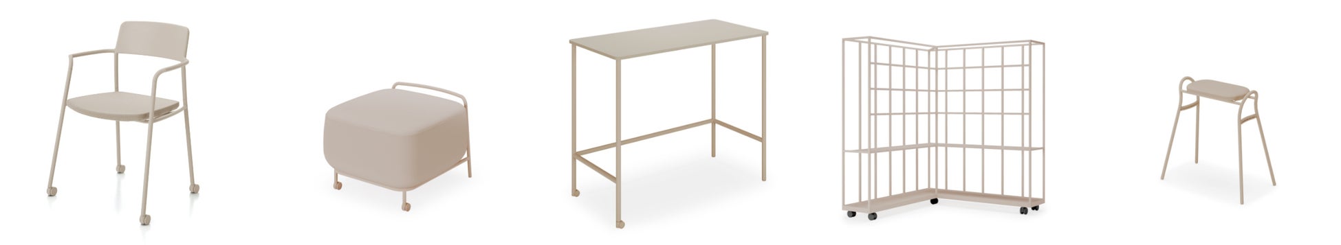 すべてのアイテム共通で、小回りがきき、動かしやすい360度キャスターが備わります。また、掴みやすいフレーム形状を最小限のパーツで構成しています。スタッキング方法を共通化しているため収納もしやすく、スペースを有効活用できます。