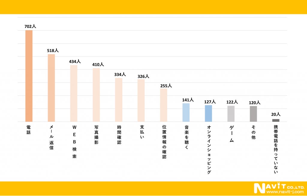 3番目に多かったのは「検索」で434人でした。最近ではインターネットやアプリが携帯電話に入っているため、いつでも調べることができます。中でも鉄道やバスなどの公共交通機関の検索や日常で疑問に感じた用語などを調べる際には素早くできるようになっております。