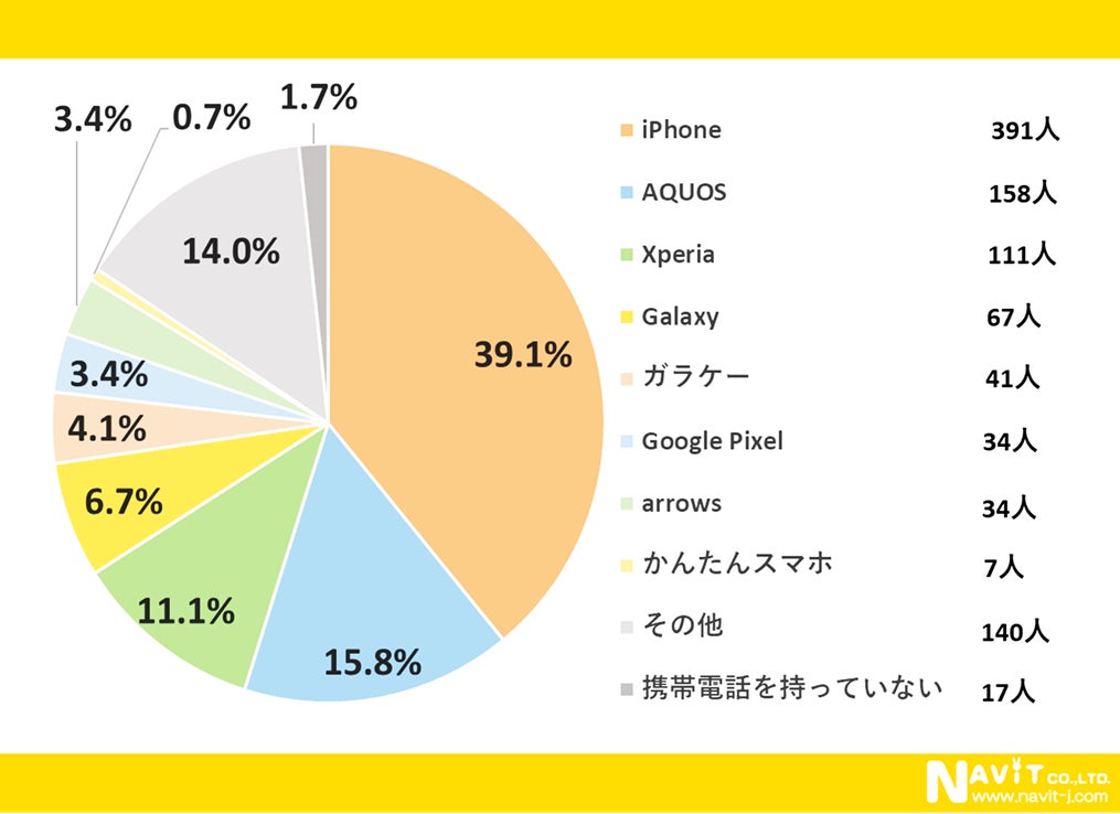 1番多いのは「iPhone」で39.1%と約4割の人が持っていました。「iPhone」は携帯電話の中でも小型です。そのことから、持ち運びやすさに優れており、場所問わずに使えるということが伺えます。ただし、小型で落としやすいことがあるので管理には十分気を付けないといけませんね。