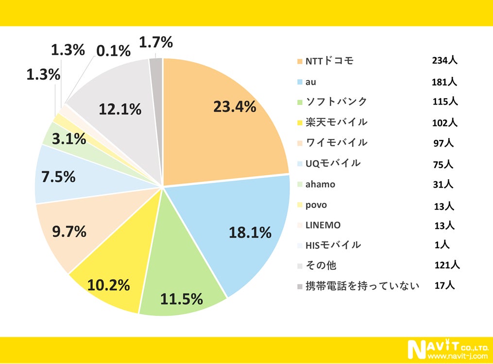 1番多かったのは「NTTドコモ」で23.4%、続いて「au」で18.1%、「ソフトバンク」で11.5%、「楽天モバイル」で10.2%となりました。ここで分かることは約6割が四大キャリアを利用していることが伺えます。