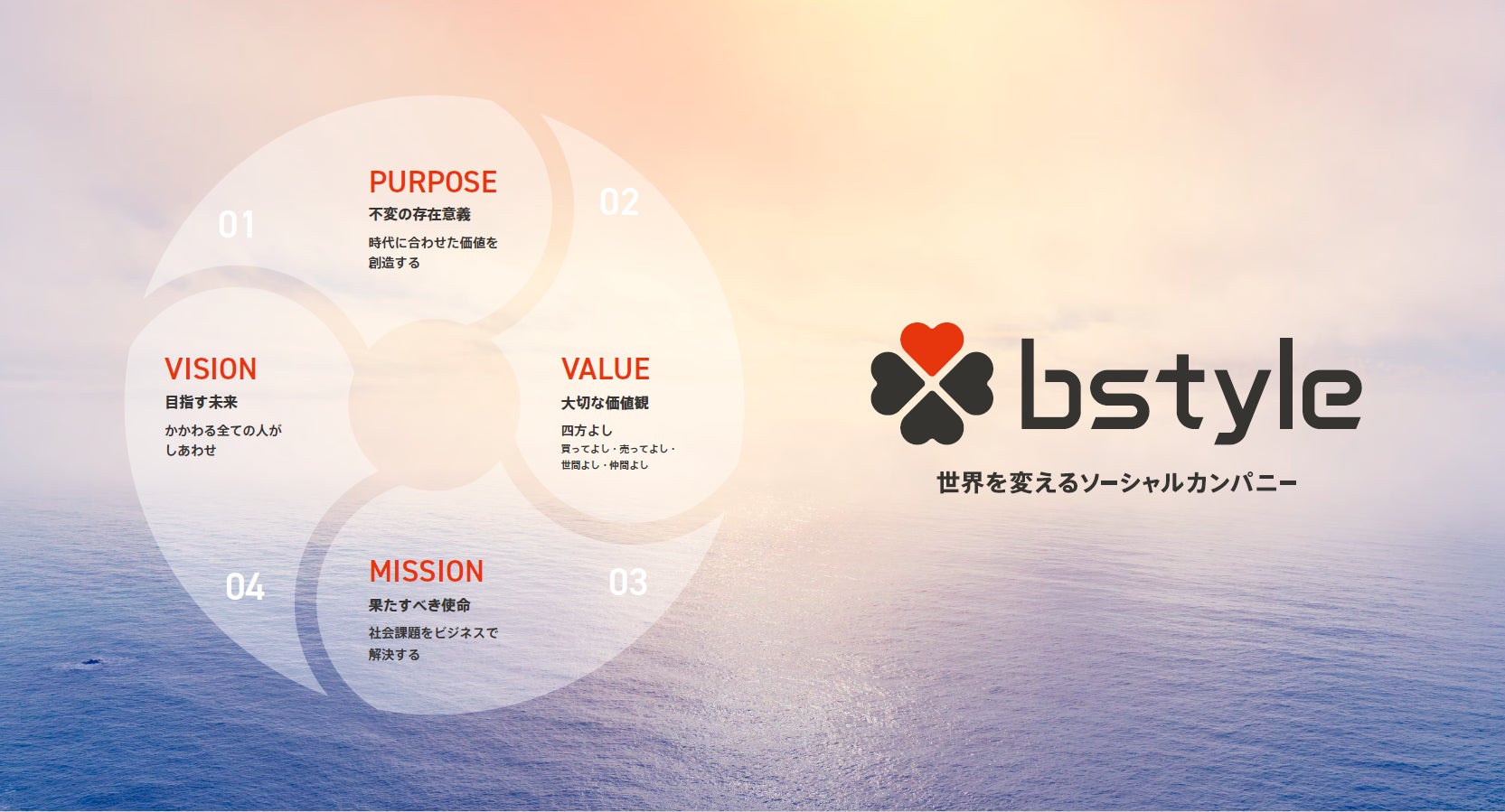 その時代の社会課題に合わせたBestな価値を創造し、事業を通じて世に広めBasicにするソーシャルカンパニーでありたいという想いから、Best Basic Styleを略した「ビースタイル」を社名にしました。