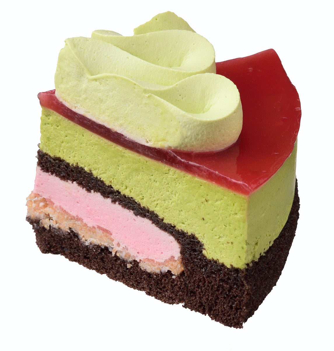 口どけなめらかなピスタチオムースとラズベリームースを重ねて、ラズベリージュレで艶やかに飾りました。ココアスポンジのほんのりビターな味わいがアクセントに。さりげなく輝く金粉が特別感を演出します。
