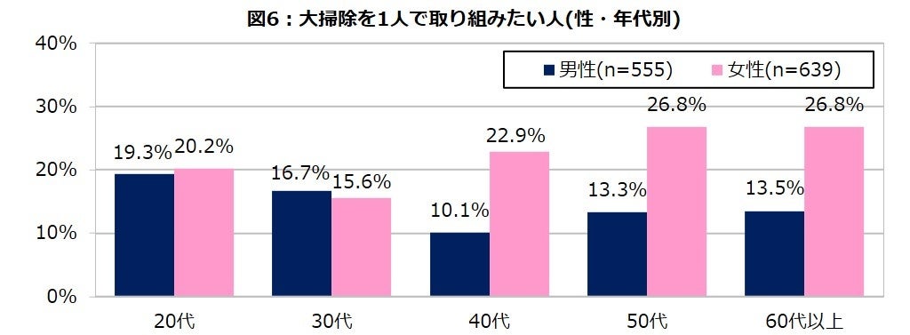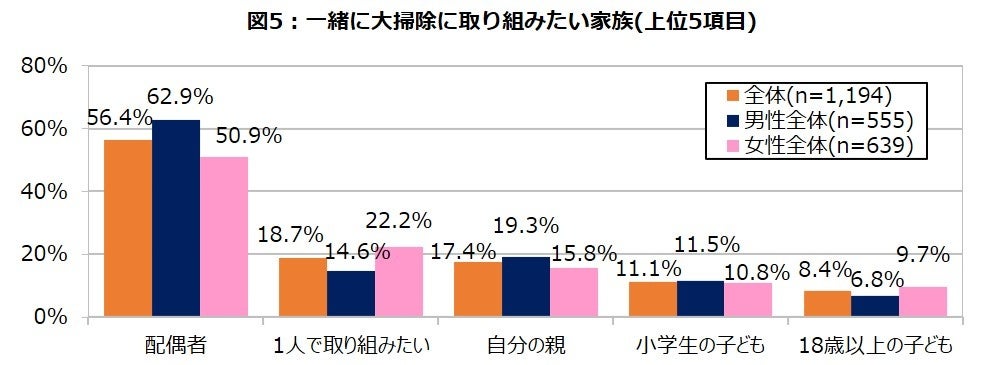 また、同居家族がいる人を対象に、家族と一緒に大掃除に取り組みたいかを聞いたところ、81.3%が「家族と一緒に取り組みたい」 と回答し、中でも1位は男女ともに「配偶者(全体56.4%、男性62.9%、女性50.9%)」でした。しかし男性の2位は「自分の親(19.3%)」である一方、女性の2位は「1人で取り組みたい(22.2%)」で、なかでも50代以上の女性の4人に1人は「1人で~」と回答しています。(図5、6)その理由としては、共働き世帯が増加した現在でも日常の家事は女性が多くを担っているため、他の家族に任せるより自分でやった方が効率が良い、また自分なりの段取りやルールが固定化されていて崩したくないなどの理由が推測され、特に家事ベテラン層である50代以上の女性は専業主婦も多いことからその傾向が強いと推測します。