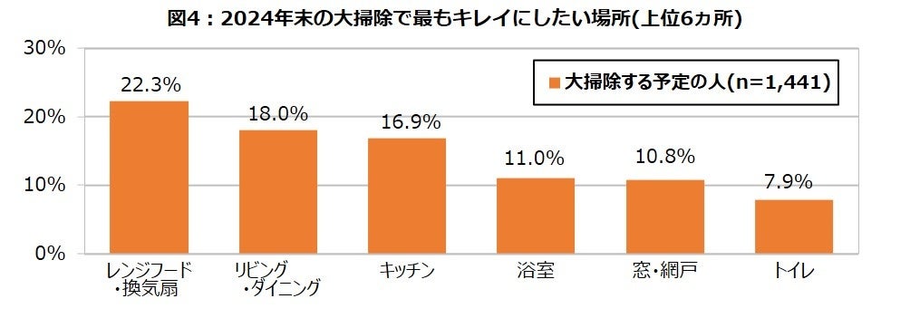 2024年末の大掃除で最もキレイにしたい場所は、当社の調査で15年連続で最も汚れが落ちにくかった場所に挙げられている「レンジフード・換気扇」 が1位でした。(図4)「レンジフード・換気扇」は高所にあり、内部の汚れに気づきにくいためか日頃はなかなか掃除がしづらい場所です。しかし油汚れを放っておくと酸化したり樹脂化してますます落としにくくなるため、1年に1回は時間をかけて大掃除に取り組んだり、プロに掃除を依頼するなどして汚れをしっかり落とすことがお勧めです。また掃除後は1か月に1回を目安にフィルターを交換するなど内部に汚れがつくのを予防する対策も大切ですので、ぜひ予防策にも取り組んでみてはいかがでしょうか。