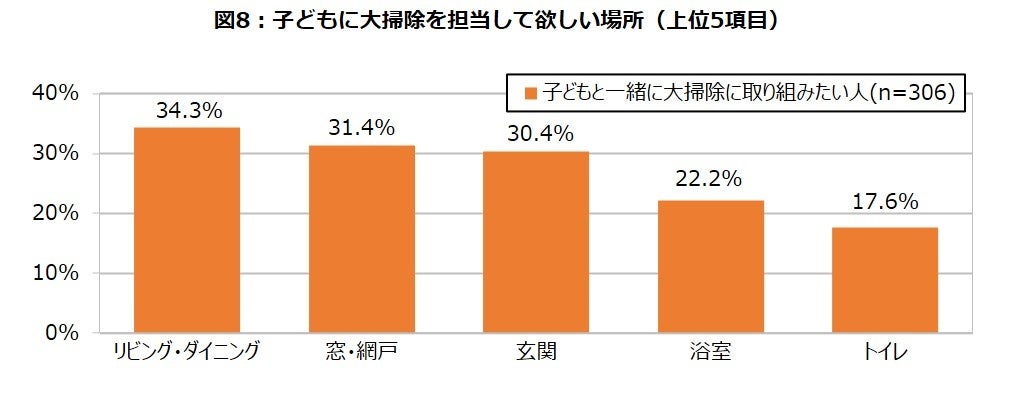 「家族と一緒に取り組みたい」と回答した人に、それぞれの家族に担当して欲しい場所を聞いたところ、夫には、大掃除実態調査で“大掃除のときだけ掃除する場所”の上位に例年挙げられる「窓・網戸」を、妻には女性自身も“自分が一番良く使う場所”と実態調査で回答している「キッチン」を、子どもには家族の共有スペースである「リビング・ダイニング」を担当して欲しいという回答となりました。(図7、8)