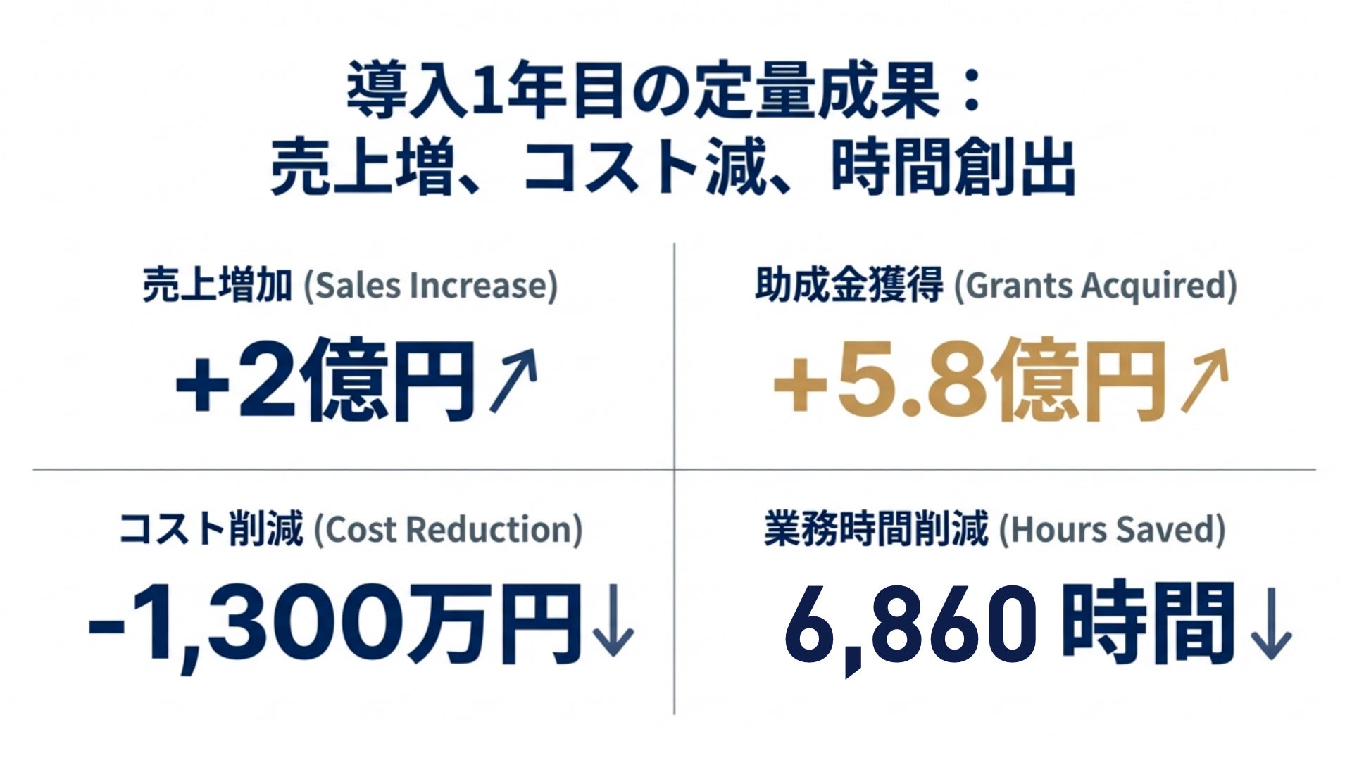 導入後は「全ての業務にAIを」というスローガンのもと、毎朝の全社朝礼での事例共有や定例勉強会などAIの浸透/活用を徹底した結果、導入わずか1年目で売上2億円増・業務時間6,860時間削減・コスト1,300万円削減・助成金5.8億円獲得という大きな成果を得られました。
