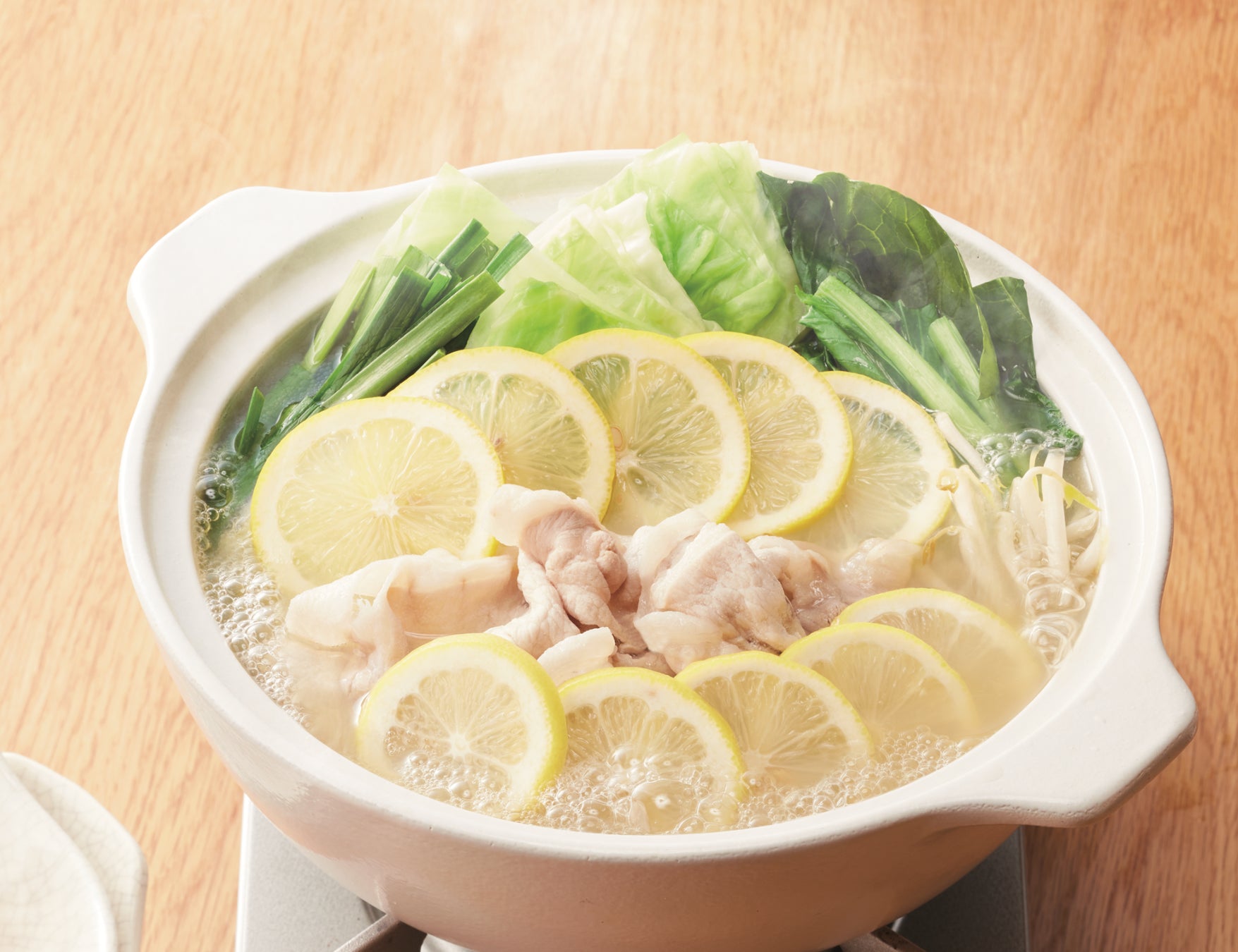 鶏がベースのあっさり風味のストレートスープが放牧豚ロース肉と相まって、お肉のうまみを際立たせます。そこに皮まで安心して食べられる規格外の「ふぞろい国産レモン」スライスをのせ、レモンの酸味・ほどよい苦味が加わり、新鮮味のある飽きのこないお鍋に仕立てました。お肉にまとったレモンの香りが食欲をそそる一品です。