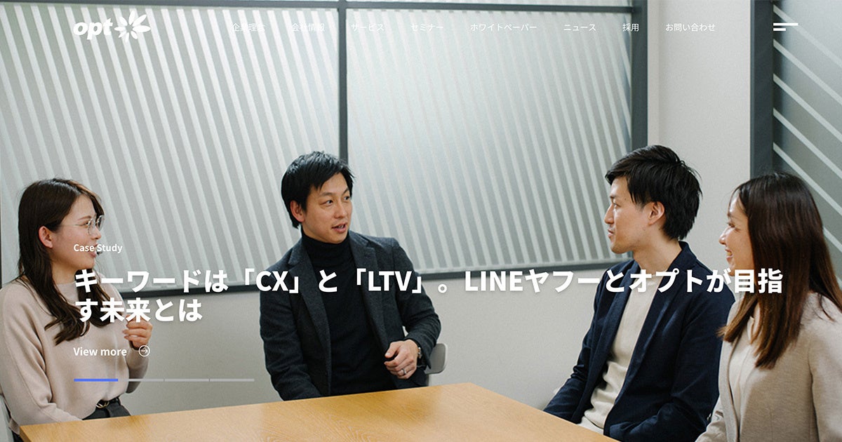 本リニューアルのコンセプトは、新生オプトが、“近く、深く、速く、そして永く。顧客を先導するグロースリーダー”であることを、Webサイト内のあらゆるデザイン・コンテンツを通じて表現しています。具体的には、当社のみのメッセージとして発信するのではなく、パートナー企業との連携や当社の支援を通じて、実際にどのように顧客企業の事業成長につながっているのか、パートナー企業や顧客企業からいただいた「声」を軸に、オプトのケイパビリティとともに、ストーリーとしてお伝えしています。