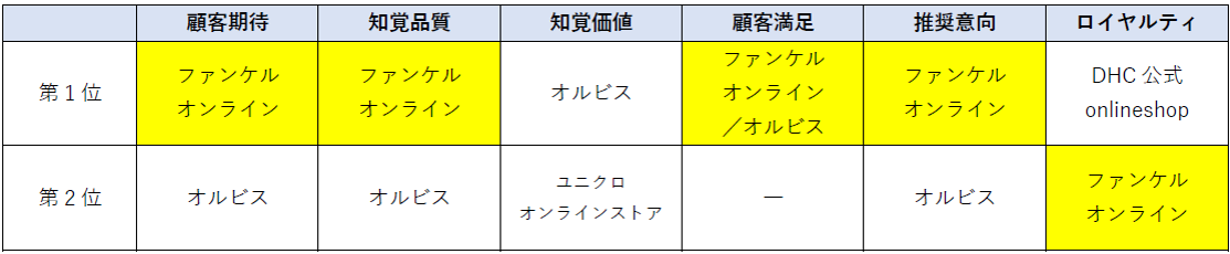 - 各指標の順位表(通信販売業種 自社ブランド型)
