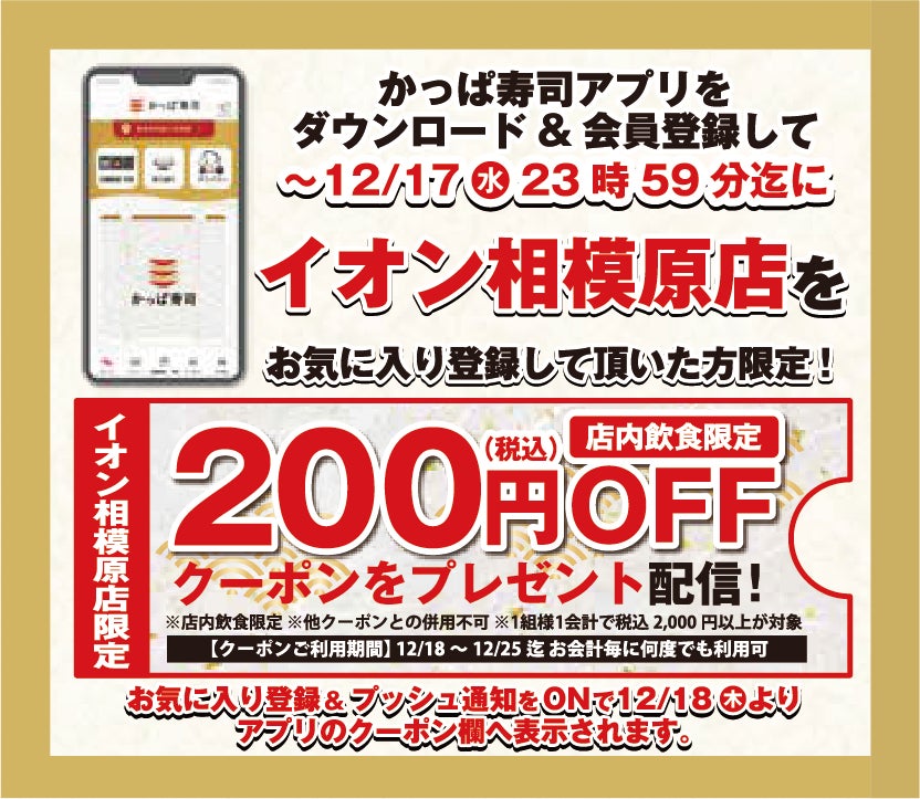 かっぱ寿司公式アプリをダウンロード&会員登録いただき、12月17日(水)23時59分までに「かっぱ寿司 イオン相模原店」をお気に入り登録いただくと、12月18日(金)から12月25日(木)まで、お会計毎に何度でもご利用いただける“店内飲食限定200円(税込)OFFクーポン”をプレゼント配信いたします。