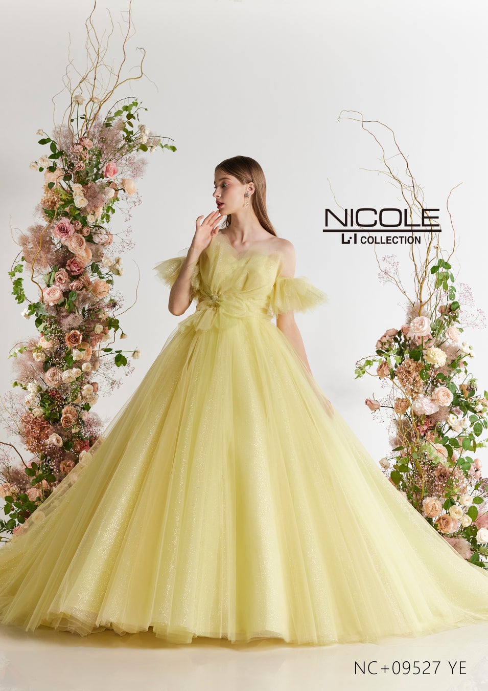 レモンイエローと少しくすみのあるハニーイエローをミックス。身頃の花びらとフリルショルダーで華やかさをプラスしたフォトジェニックな1着です。