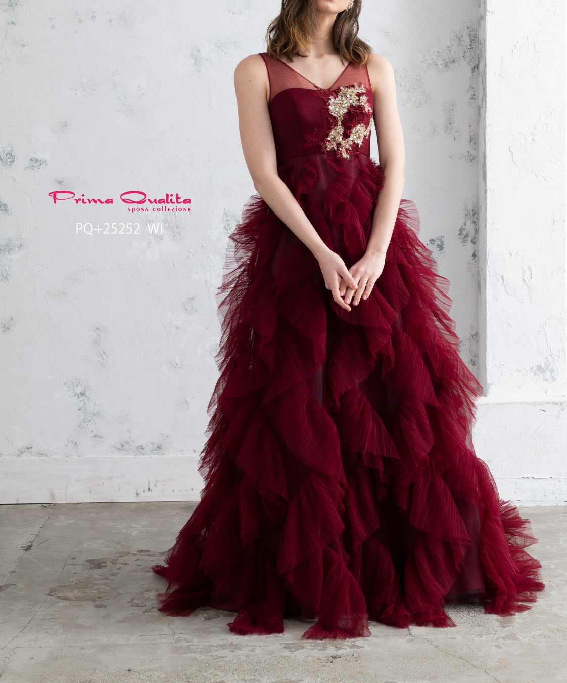繊細な胸元の刺繍が存在感を放つカラードレス。 身頃は切り替え位置にこだわったコンパクトなシルエット。 縦のラインを意識したたっぷりのプリーツフリルで軽やかな動きを表現しました。