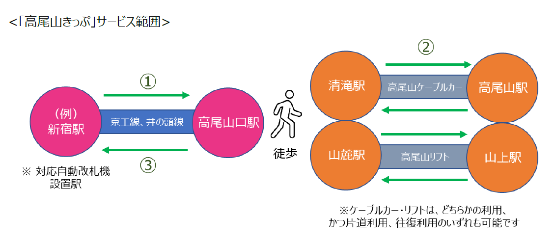 ①京王線・井の頭線の一部の駅に設置した対応自動改札機を利用して乗車し、高尾山口駅にて下車