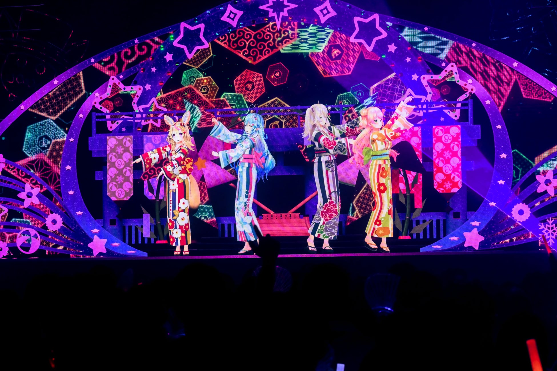 ここで新衣装である浴衣に着替え、七夕にちなんだセットを背後に、4人全員でラミィのオリジナル曲「明日への境界線」をパフォーマンス。メンバーカラーを基調としつつ、それぞれに花柄の生地と髪飾りをあしらった浴衣姿はとても華やかだ。