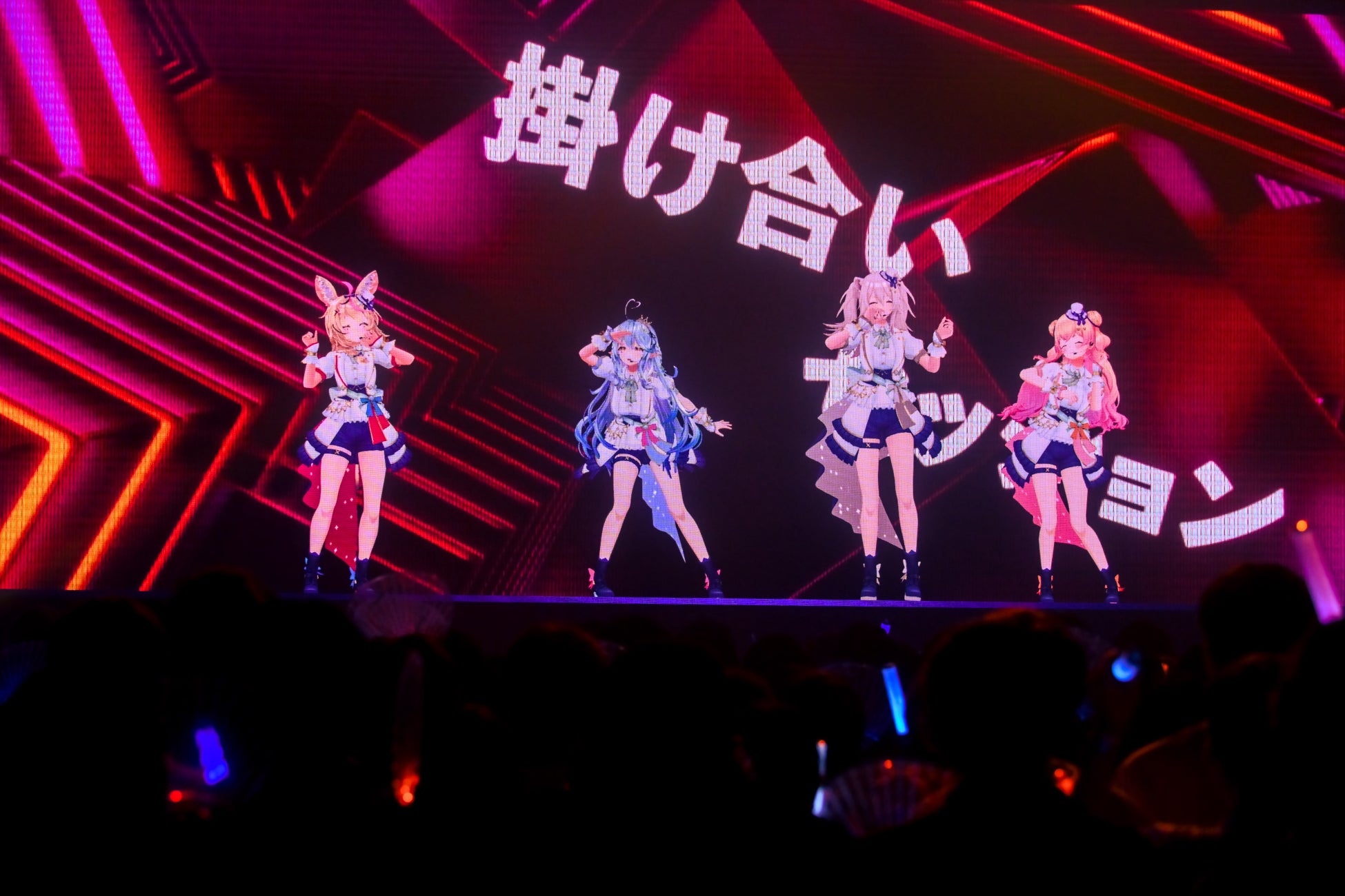 ステージ背景が切り替わり、ラミィ、ポルカが歌唱を担当する形でYOASOBIの「群青」をカバー。メンバーの動きはしなやかなものに切り替わり、真剣な表情から放たれる歌声には感情がこもる。休むことなく、今後は歌唱をぼたん、ねねに交代してSEKAI NO OWARIの「Habit」をカバー。2人による新鮮な低音域はもちろん、陣形も振付も複雑な難度の高いダンスで、4人はアイドルとしての成長を見せた。