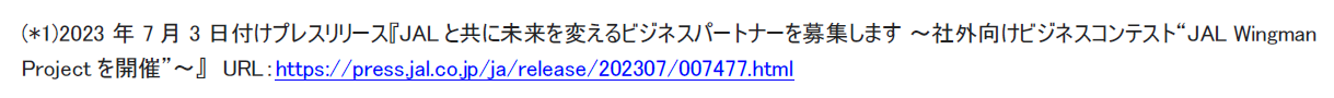 (*1)2023 年 7月 3 日付けプレスリリース『JALと共に未来を変えるビジネスパートナーを募集します ~社外向けビジネスコンテスト“JAL Wingman Projectを開催”~』