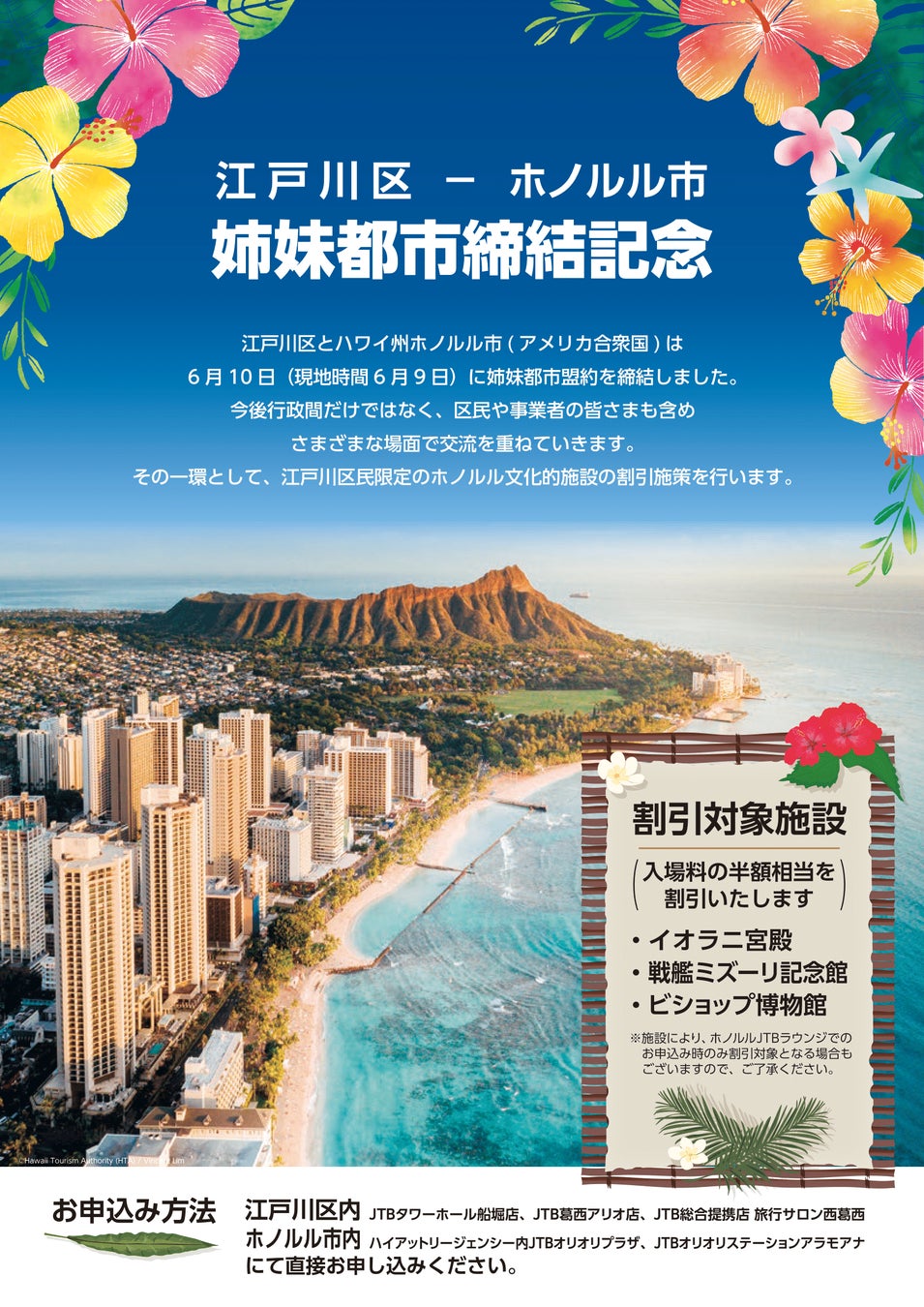 株式会社JTB(以下「JTB」)は、東京都江戸川区(以下「江戸川区」)と連携し、江戸川区とアメリカ合衆国ハワイ州ホノルル市(以下「ホノルル市」)の姉妹都市盟約締結を記念する取り組みとして、江戸川区民が JTB の対象店舗にてホノルル市の文化的施設を訪問するオプショナルツアー及び入館チケット(以下「対象商品」)を購入する際に割引が受けられる事業を、12月1日より開始いたしました。